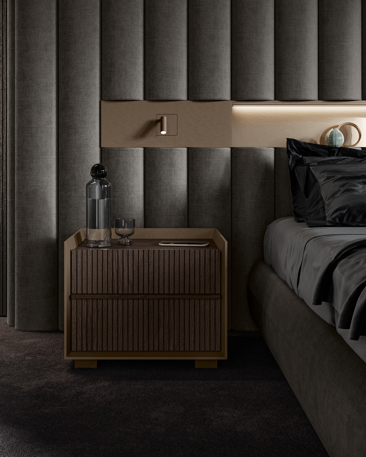 Collection named after our design code for its details. It is characterized by a central unit housing the drawers and a “C” – shaped taper structure that wraps the drawers. Available with structure in metallic lacquer or matt lacquer and drawers in oak. 10: 2 customization available on the drawer fronts.