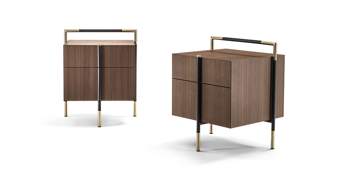 Elegance with a vintage allure for the Kevin night table: a sophisticated mix of materials that combines the cubic volume in wood with a light metal structure, enriched by details in contrast. A precious object for the night area for tasteful furnishing.
