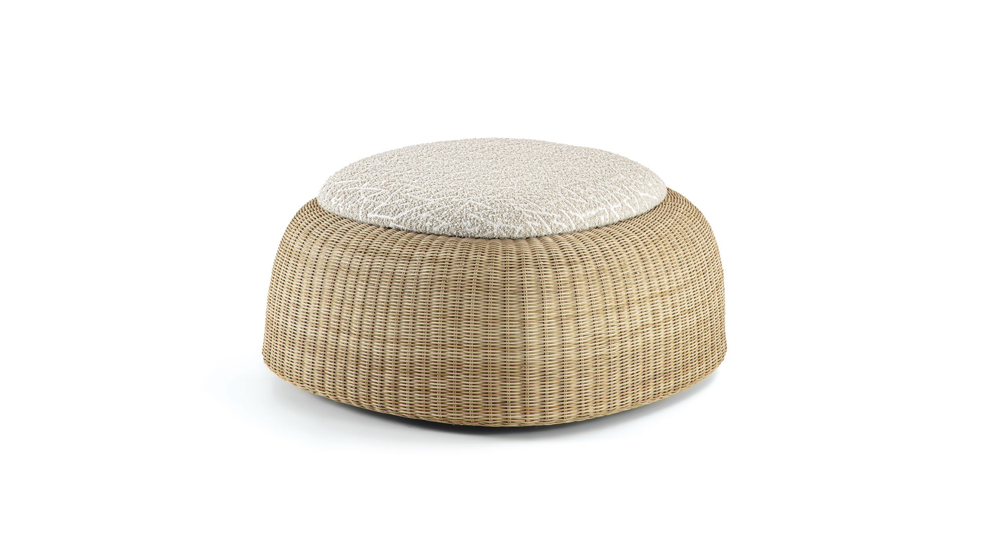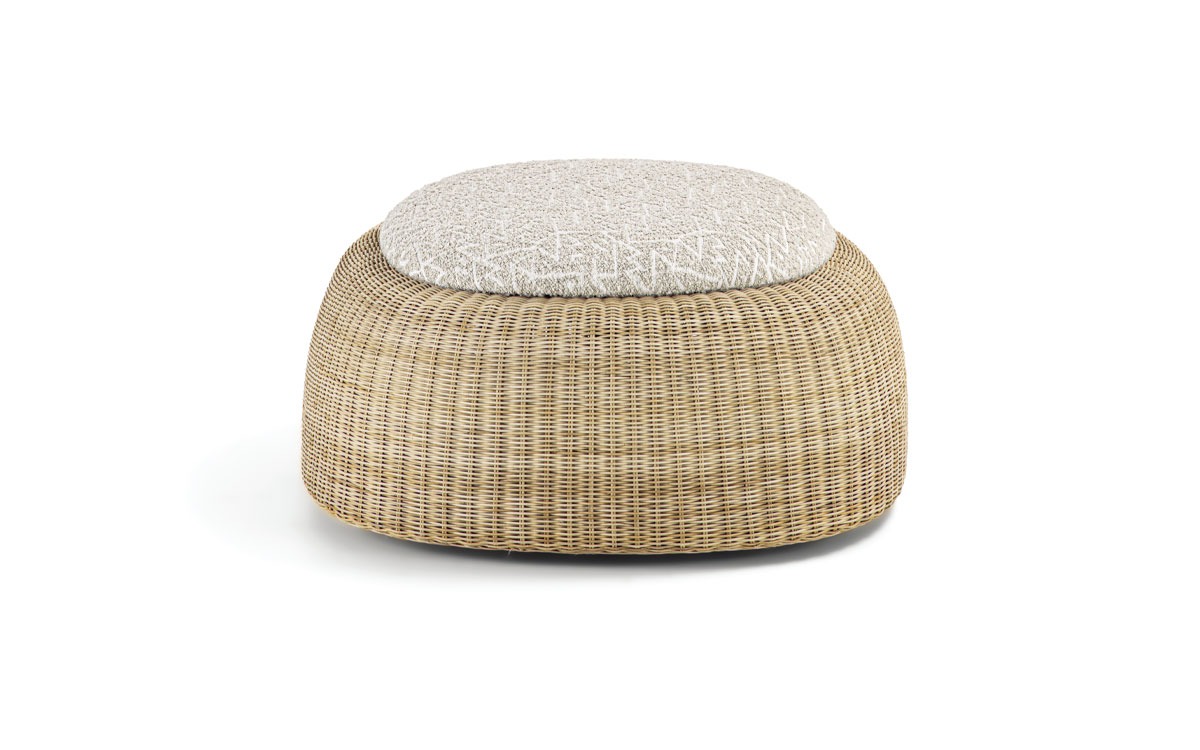 Sam pouf, design Federica Biasi, features a woven wicker frame with a soft, organic silhouette. Drawing on ancient techniques, the designer carefully balances essential textures, colors and natural materials for têtê a têtê comfort that exudes an atmosphere of serenity and warmth to reconnect with nature.