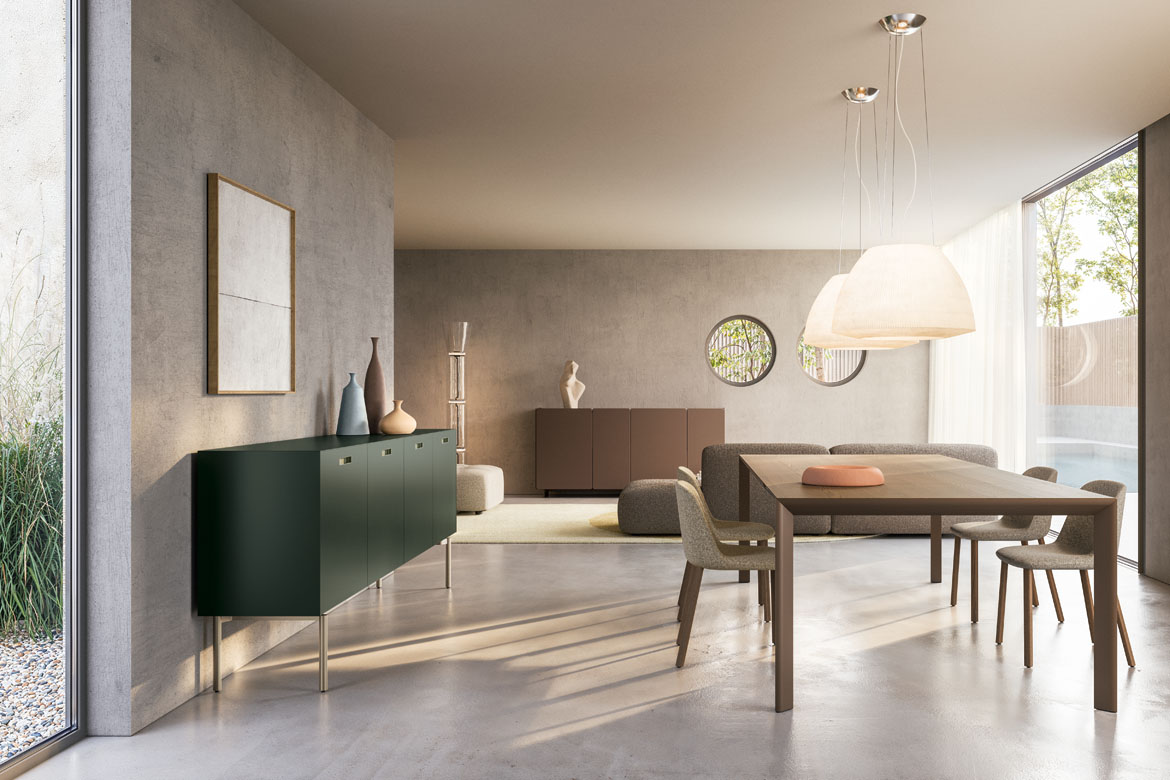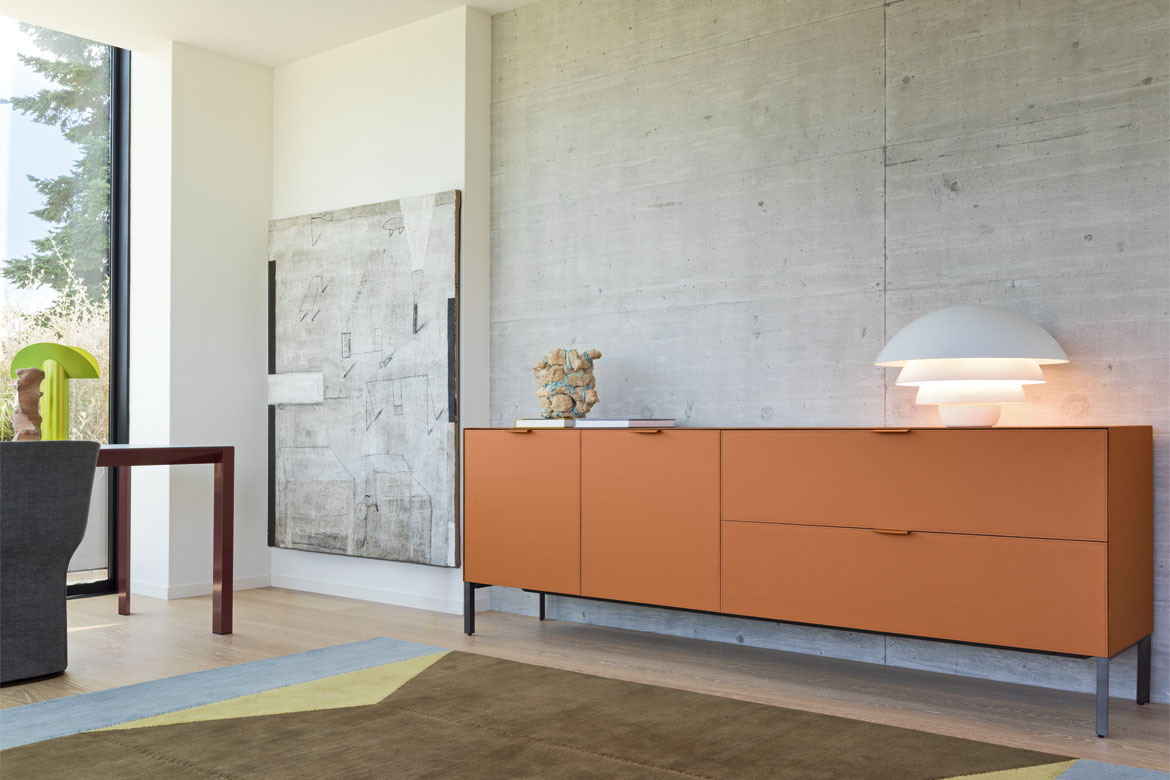 It reprises the elegance and structural style of the Norma sideboard with the configuration of a day system. Norma up has an extraordinary choice of options in every aspect, size, style and function. You can create countless combinations by adding open modules and drawers, as well as classic storage compartments with hinged or flap doors. There’s an impressive variety of support bases: four feet, plinth, metal tube base, wall-mount for cabinet arrangements, or the classic Norma collection base with shaped feet. There an equally wide choice of handles in leather, recessed and even a push-pull system. Perimeter lighting and bar kits are available for the interiors, which can be created with the same finish as the exterior.