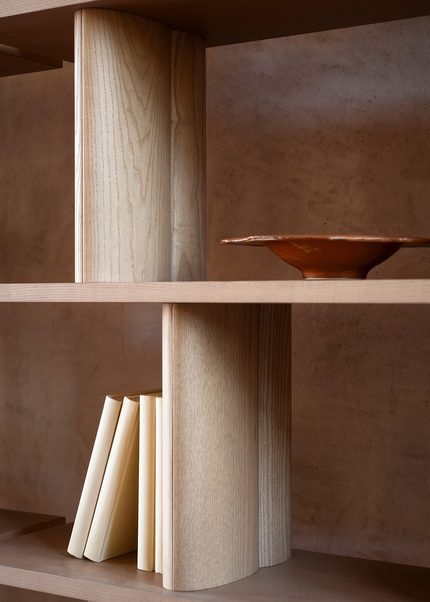 Inspired by the open pages of a book, the Pages bookshelf is characterized by solid wood uprights with sinuous and asymmetrical lines that evoke the gentle curve of turned paper. Its rigorous and dynamic structure reflects Potocco’s expertise in combining soft and geometric shapes in a harmonious balance.