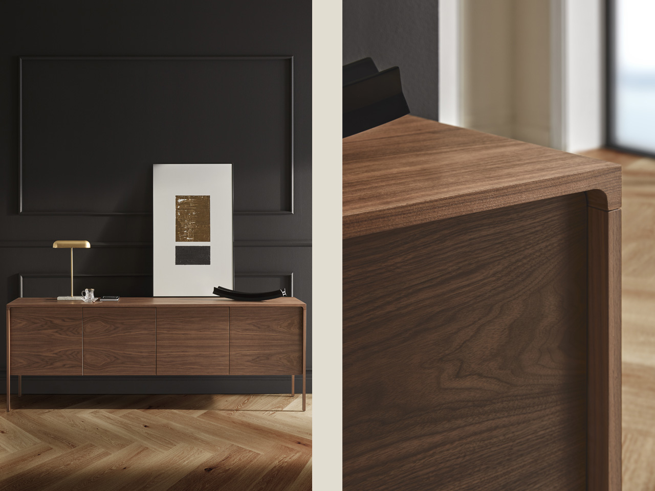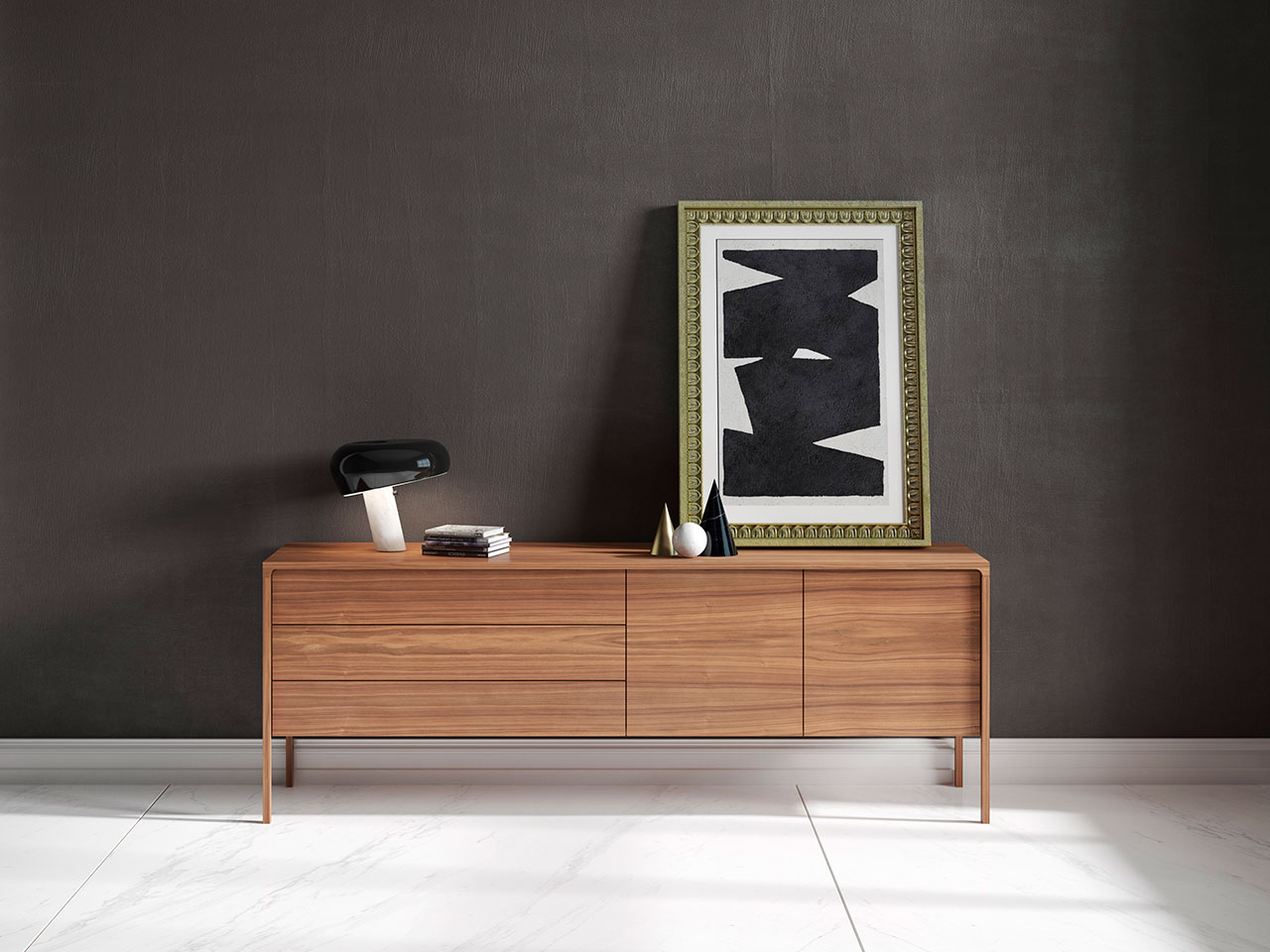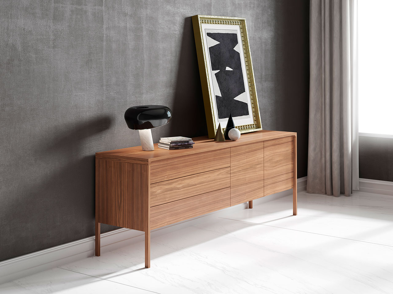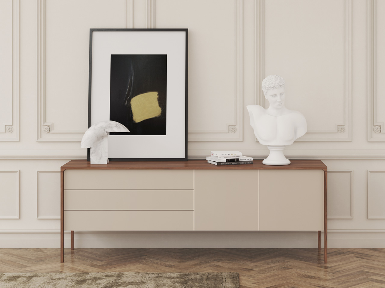 Collection of sideboards, winners of the 2008 Wall Paper award delicately supported on slender legs at their ends on adjustable feet.