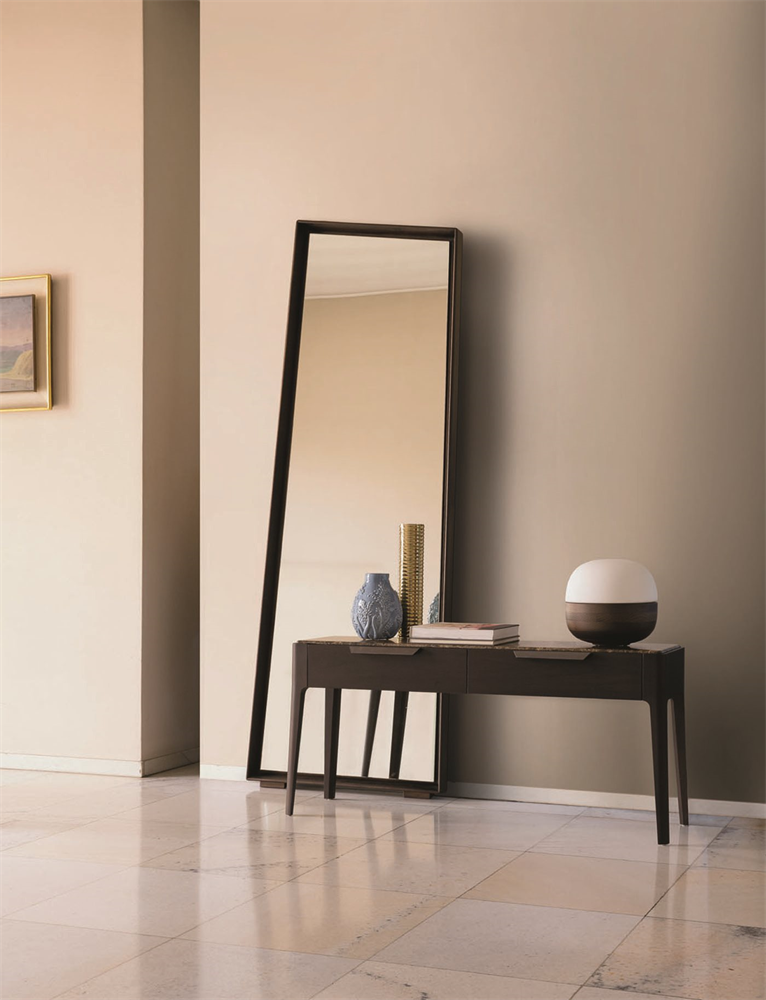 Console with two drawers with frame in solid canaletta walnut and top in wood, marble or backcoated frosted glass.