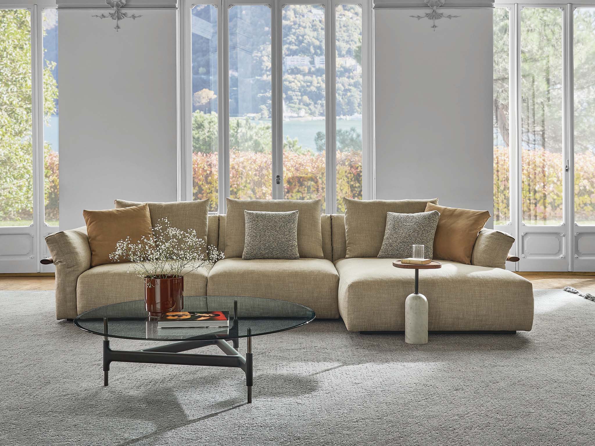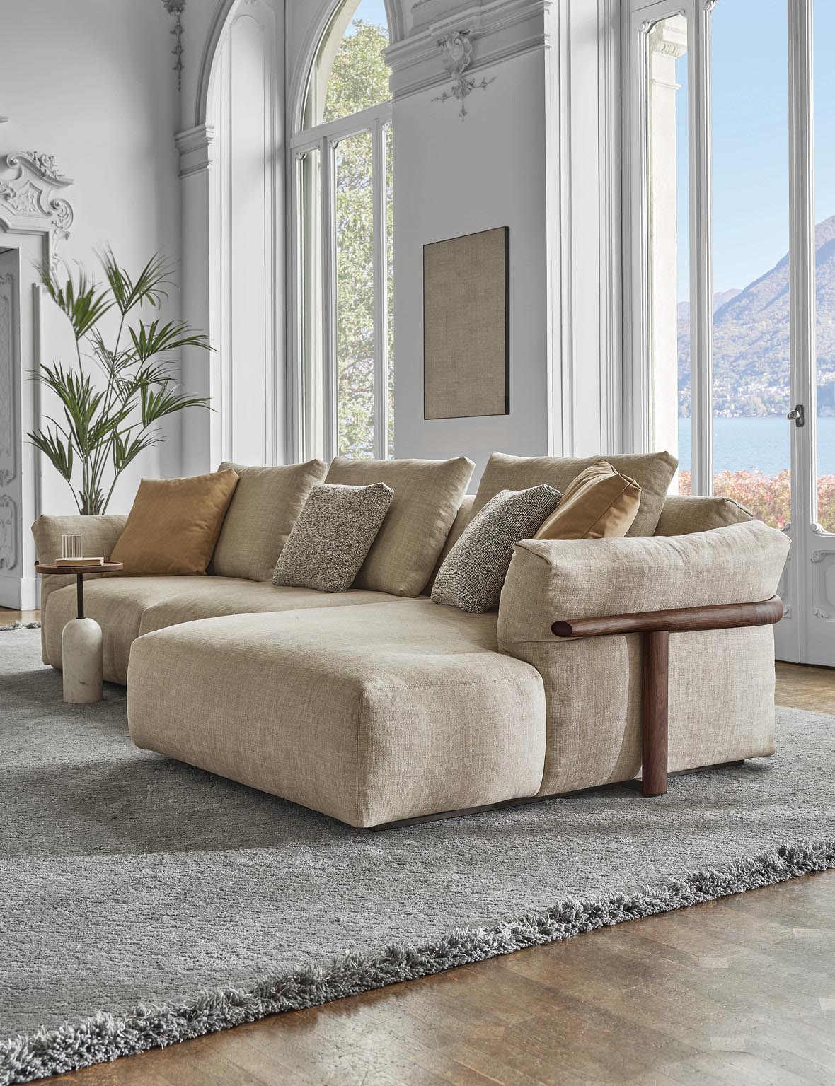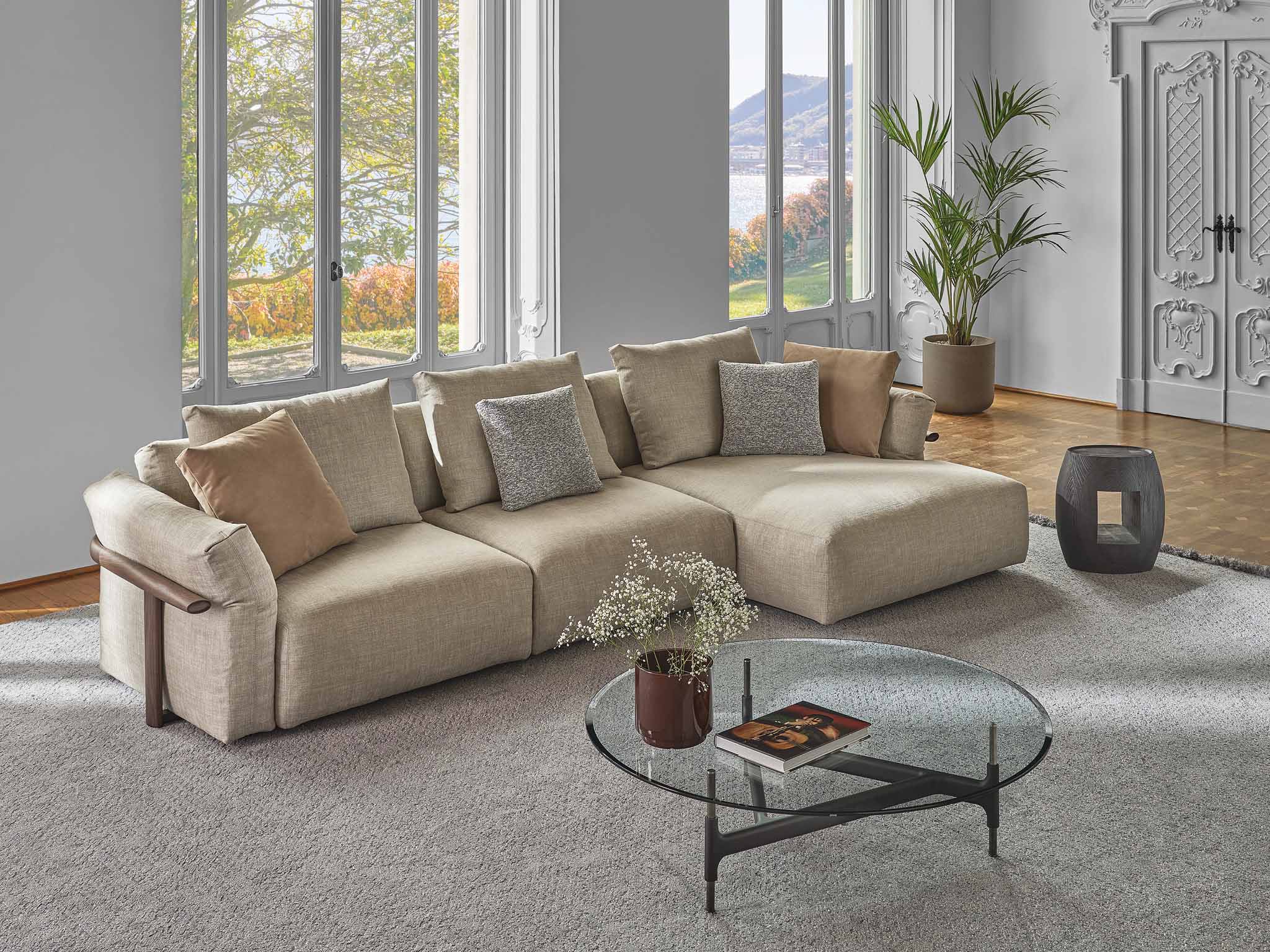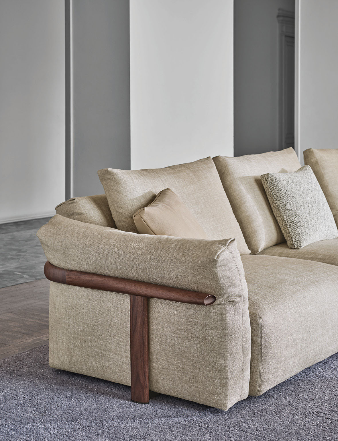 A modular sofa with multiple configurations and welcoming, generous shapes, embraced by a structure in wood. A system in which formality and informality, elegance and comfort, rigour and softness intertwine. The soft textile cushions follow the silhouette of the wood, drawing soft, enveloping lines, folds and pleats that become the hallmarks of Ronny’s aesthetics.