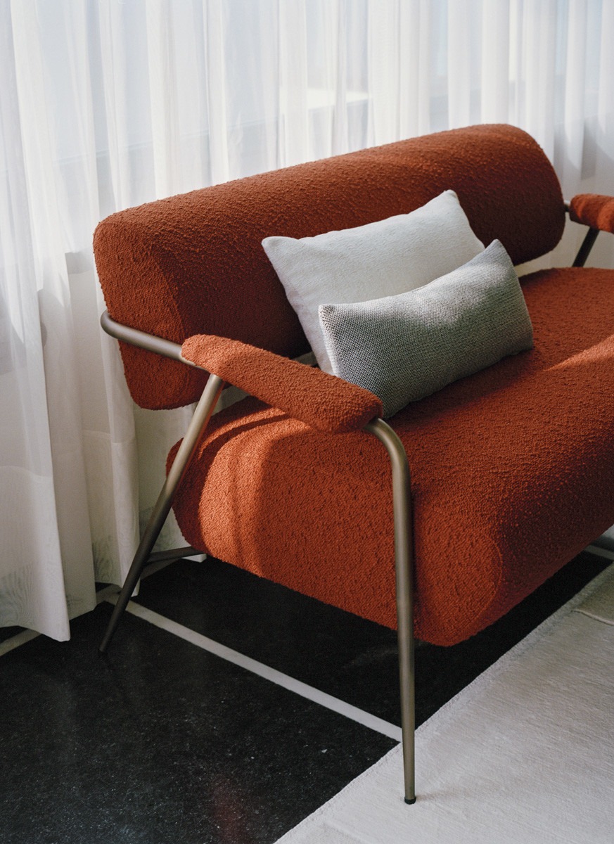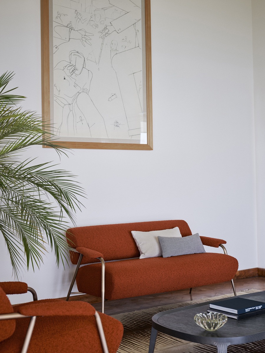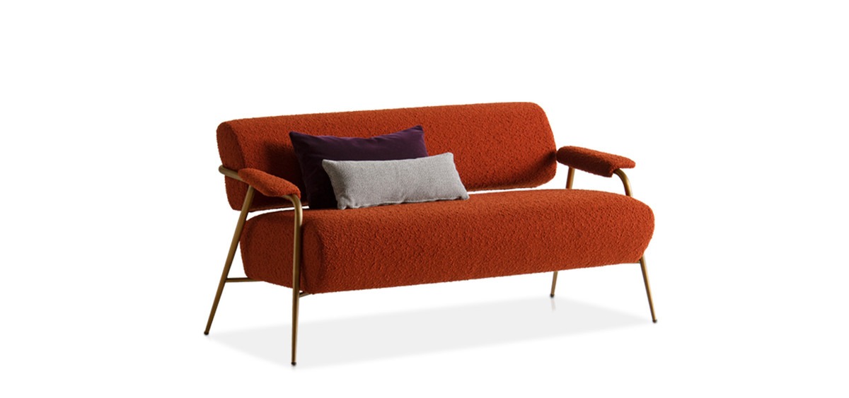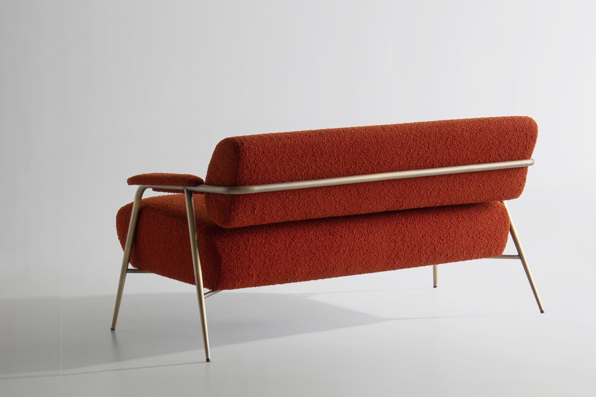 Sofa, which completes the homonymous collection, with seat and backrest padded in fire retardant polyurethane foam.Structure in metal rod, in bronzed brass or anthracite embossed painted metal finishes.Finishes and coverings as per collection