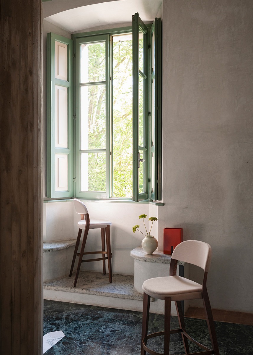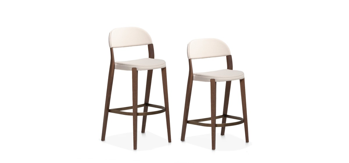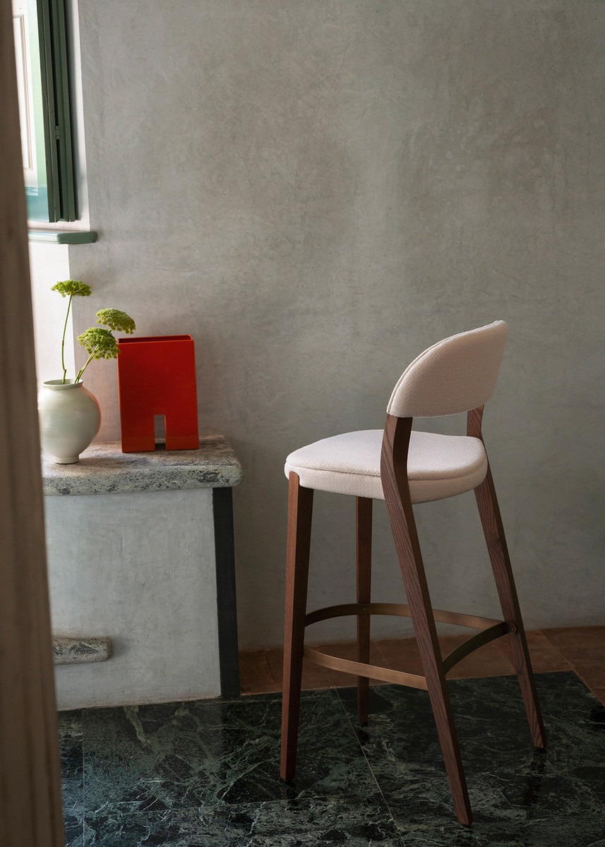 The Minima stool enriches the collection with a version featuring a fully upholstered seat and backrest for absolute comfort. Available in two heights, it features solid ash wood legs and footrests in satin gold or bronzed brass. The upholstered seat and back are covered in fabrics or leathers from the collection, or can be customized upon request.