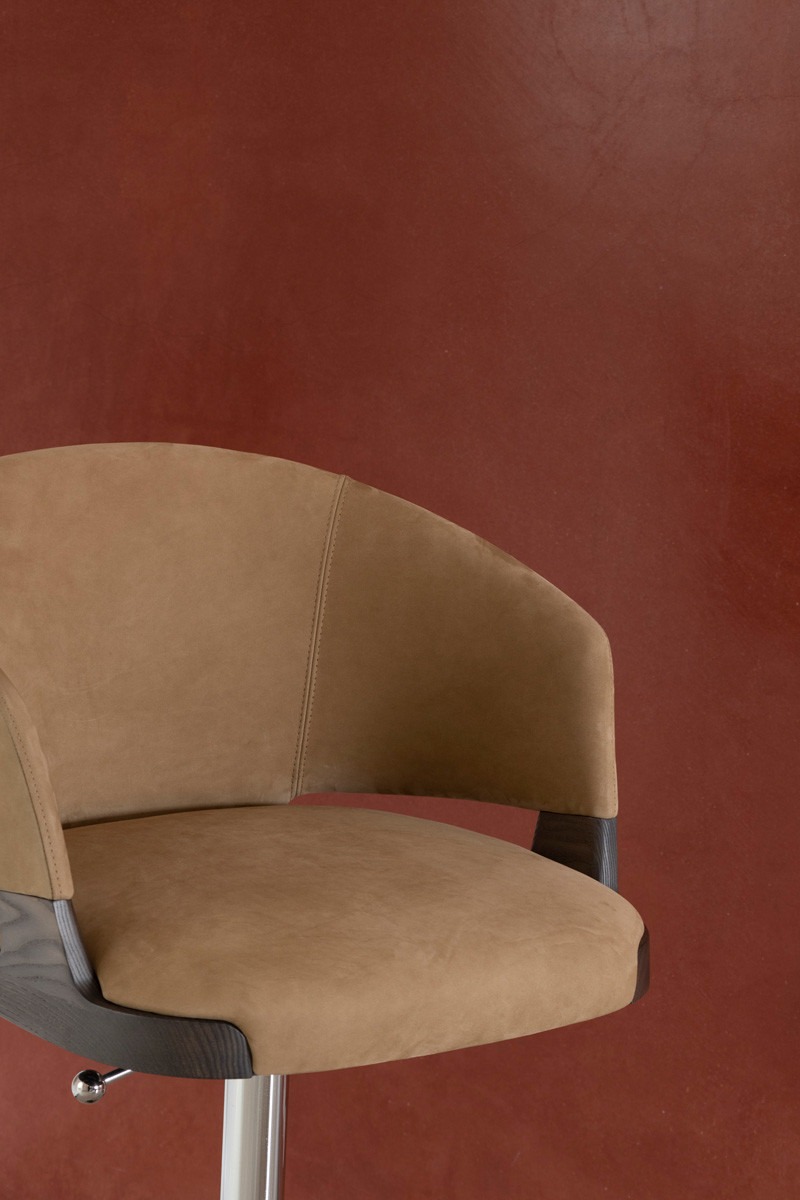 Part of the homonymous collection, Velis 942 APA-GAS is a stool with central swivel leg and round or square metal base, with gas lift system.Shell in or Ash wood.Finishes and covering as per collection.