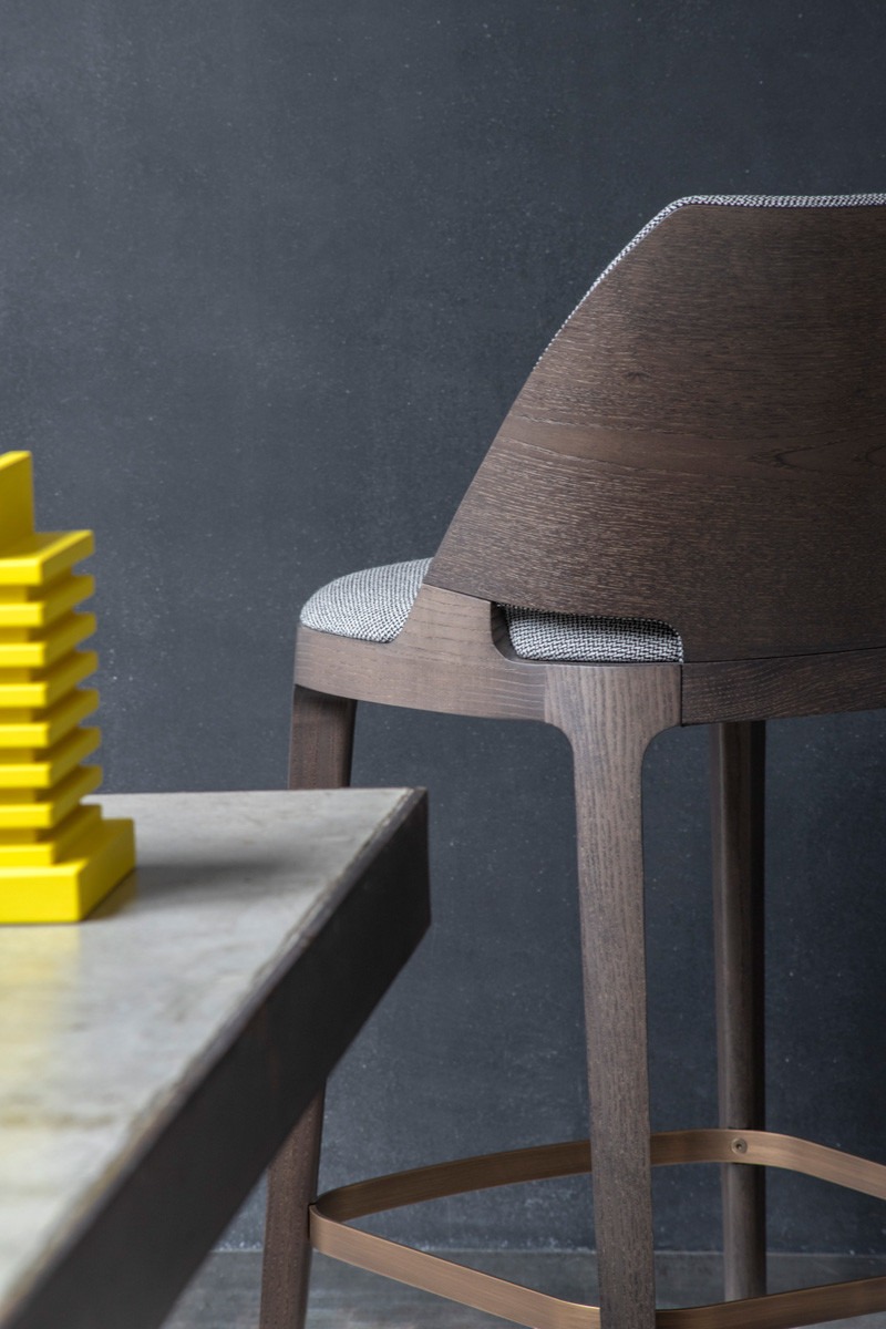 Velis is a large seating collection, which richness emerges from the encounter between the structure and the upholstery, coming together in an exposed frame in ash wood or Canaletto walnut.The already wide collection, presents a new version of the stools in two heights, with external backrest entirely in Canaletto walnut or ash wood. The seat is padded in fire-retardant polyurethane foam and is available in the various indoor coverings as per collection.