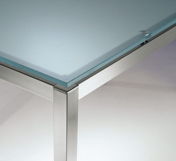 Table with powder coated, chromed or brushed steel frame. Brushed glass top.