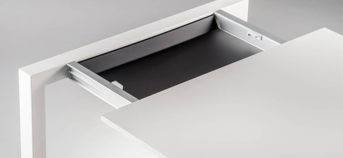 More table is the expression a new dimension of versatility by decorating the living space with style and quality. More table is available in three different dimensions. Shaped structural steel legs, aluminium sliding rails, melamine top.