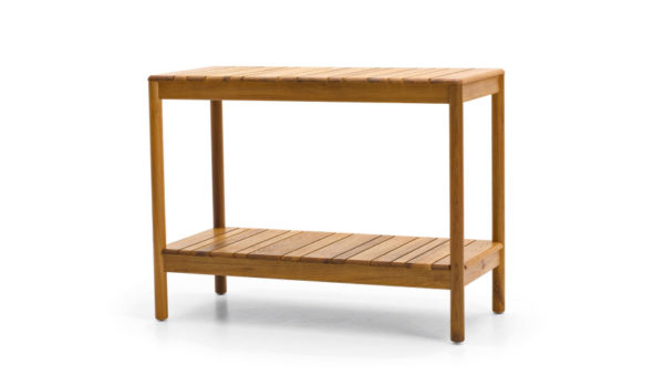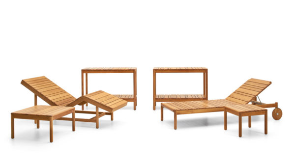 Its design stands out for the irregular arrangement of the teak wood slats of the top, which create an elegant and dynamic “barcode” effect.