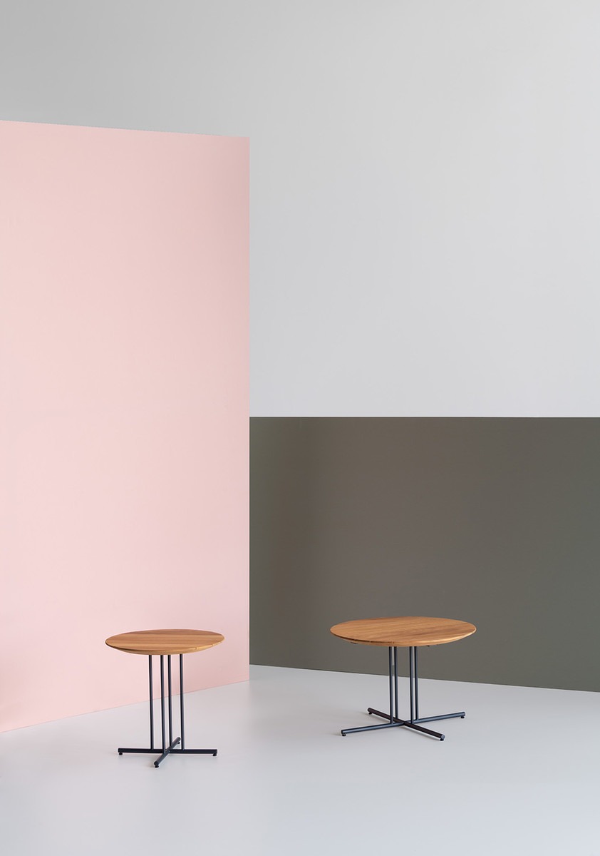 The structure, composed of thin and geometrical elements, is harmoniously combined with functional surfaces, creating tables, the bench, the writing desk and complementary coffee tables