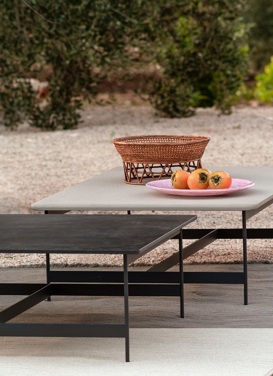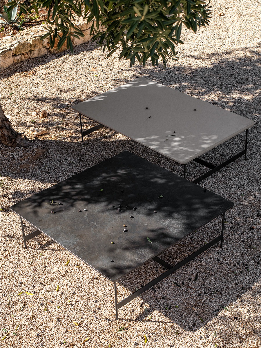 Proposed with a square or rectangular top in laminated porcelain, they are designed for both domestic and contract ambiences.