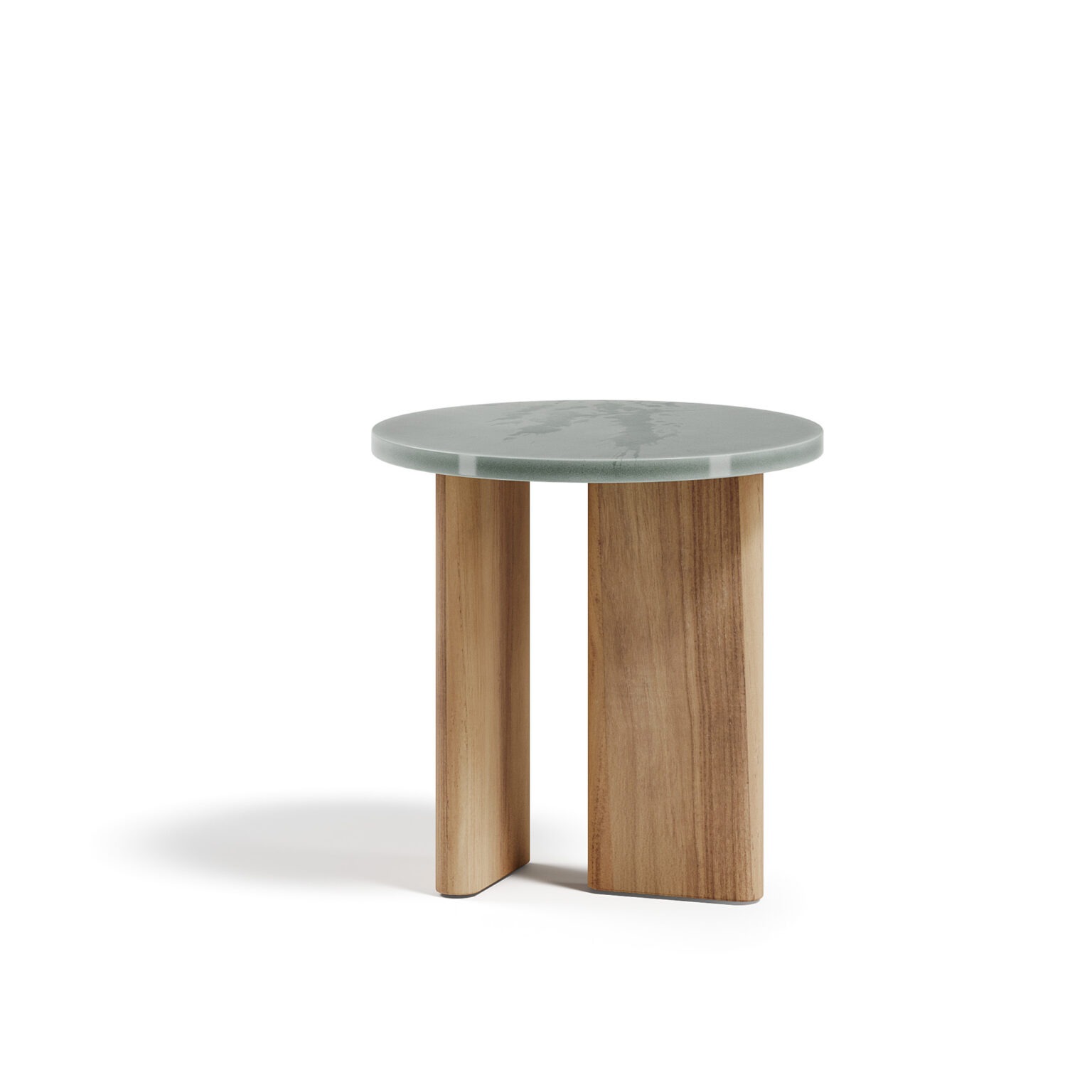 The “Materia” outdoor collection consists of a low table and a side table, featuring a round top made of glossy glazed lava stone. The structure is supported by double bases in solid Asian teak, shaped like soap bars, creating a solid and refined design.