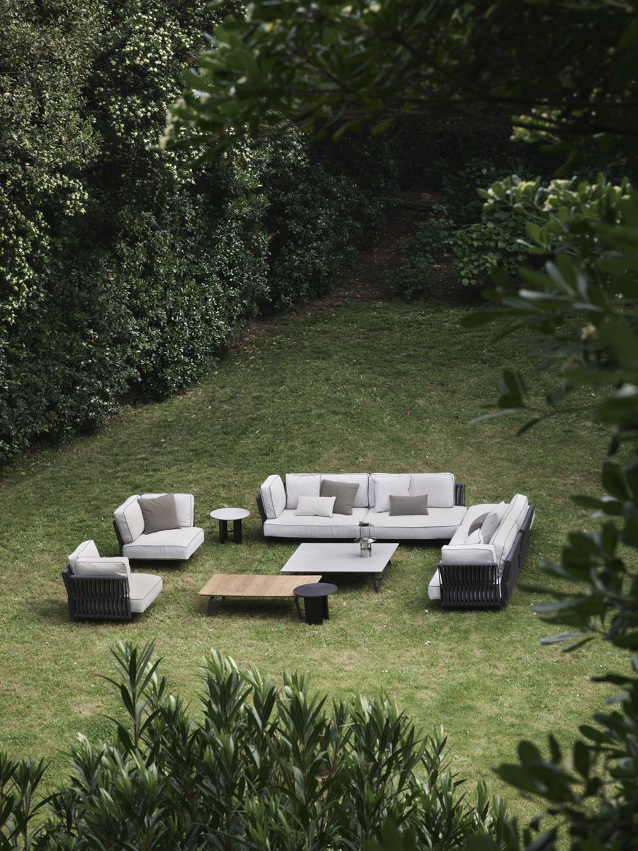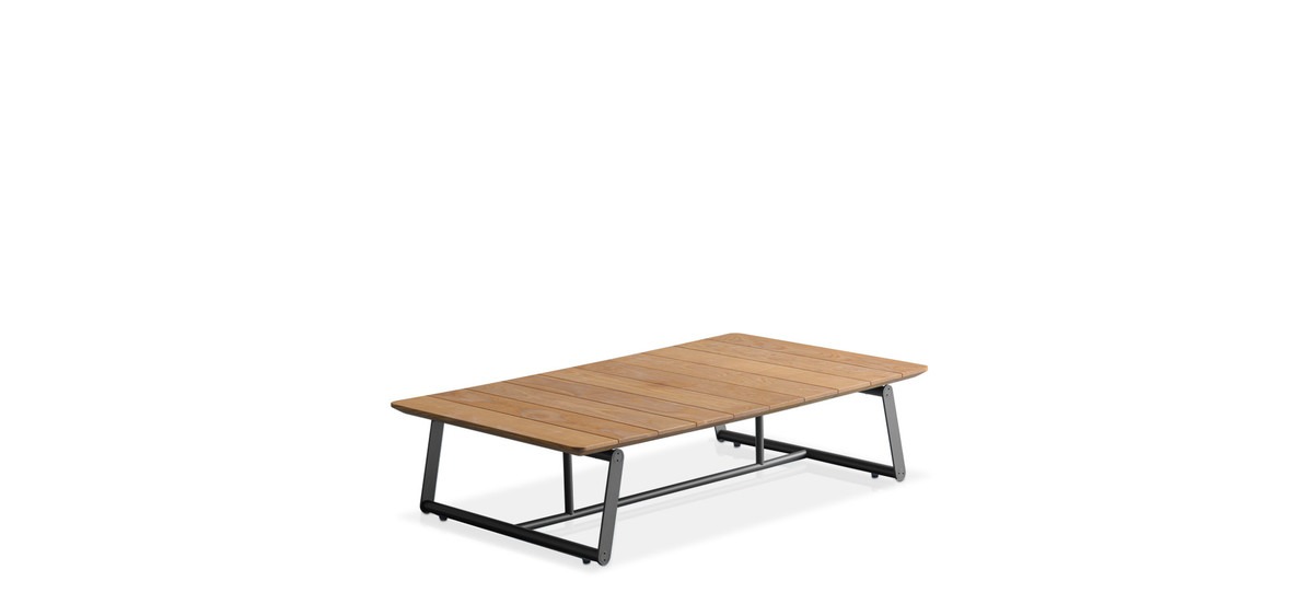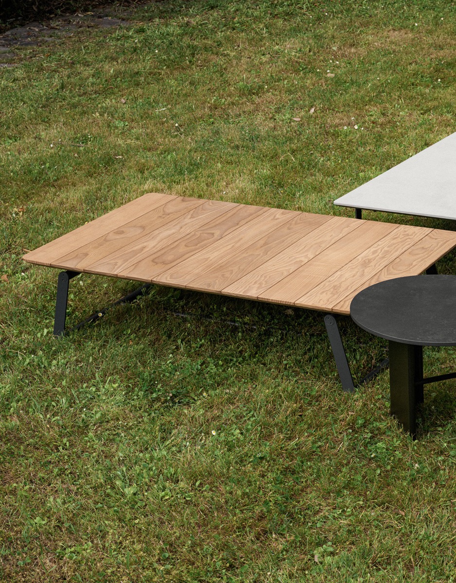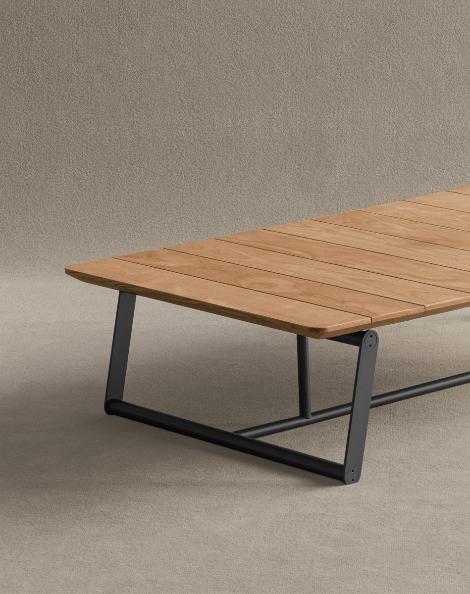 Coffee table with base in epoxy powder coated steel and rectangular top in Waterproof ash wood, laminated porcelain, or natural stone.