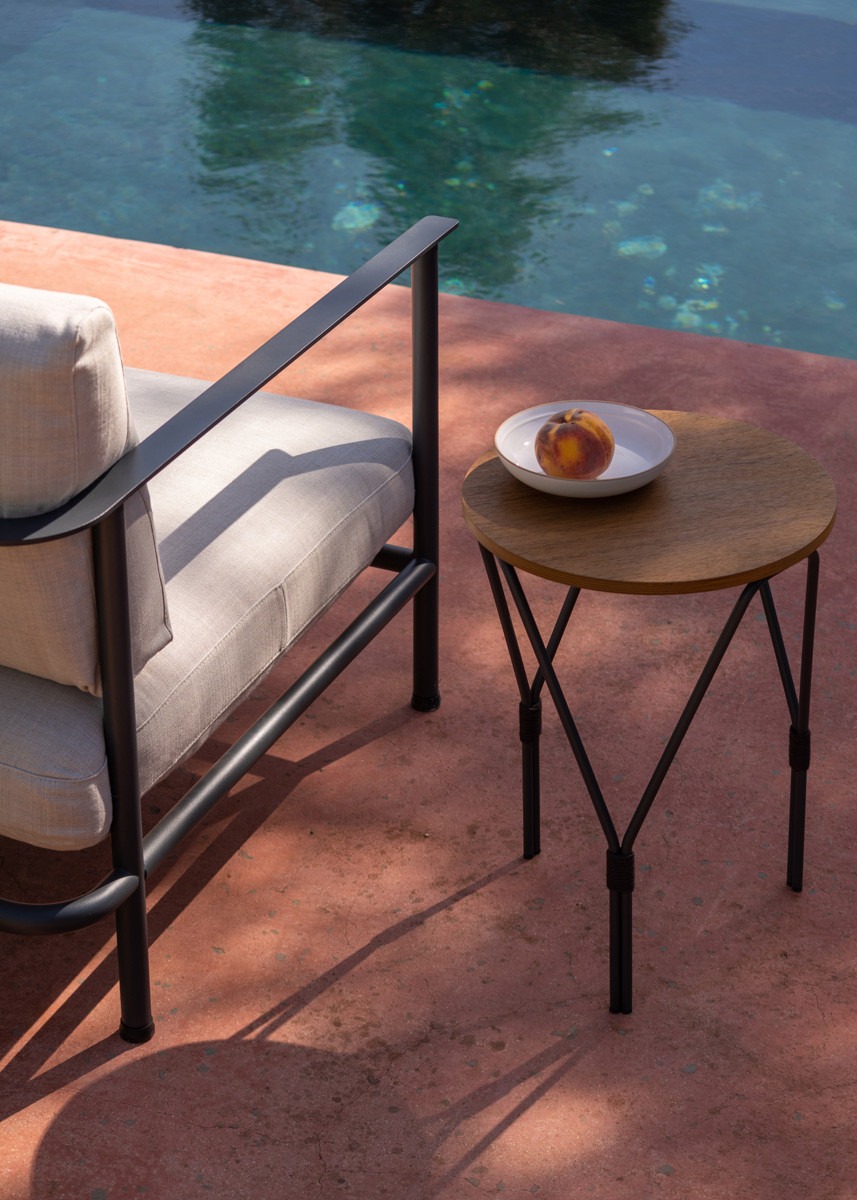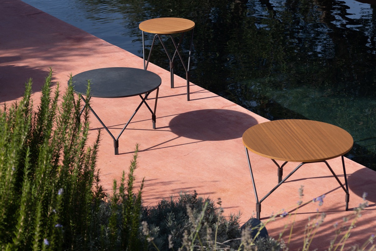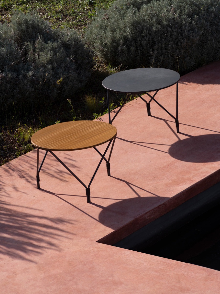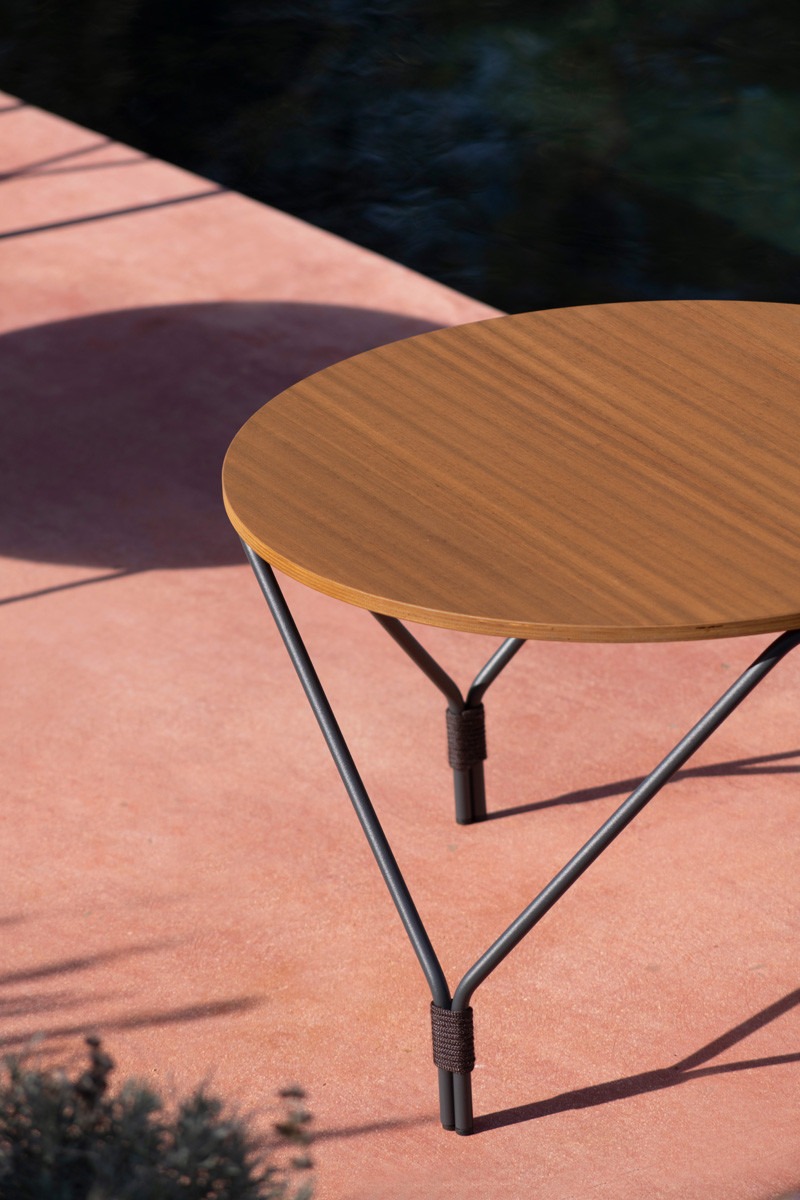 Weld is a family of coffee tables available in two heights and sizes composed of a painted metal base and nautical or “Gassa” rope details with a round top in HPL, laminated porcelain or solid Iroko wood.The structure of these tables is as simple as it is distinctive: the three thin metal tubulars of the legs, embellished by the hand woven rope around the meeting points between them, form a visual intersection that changes with the point of view.