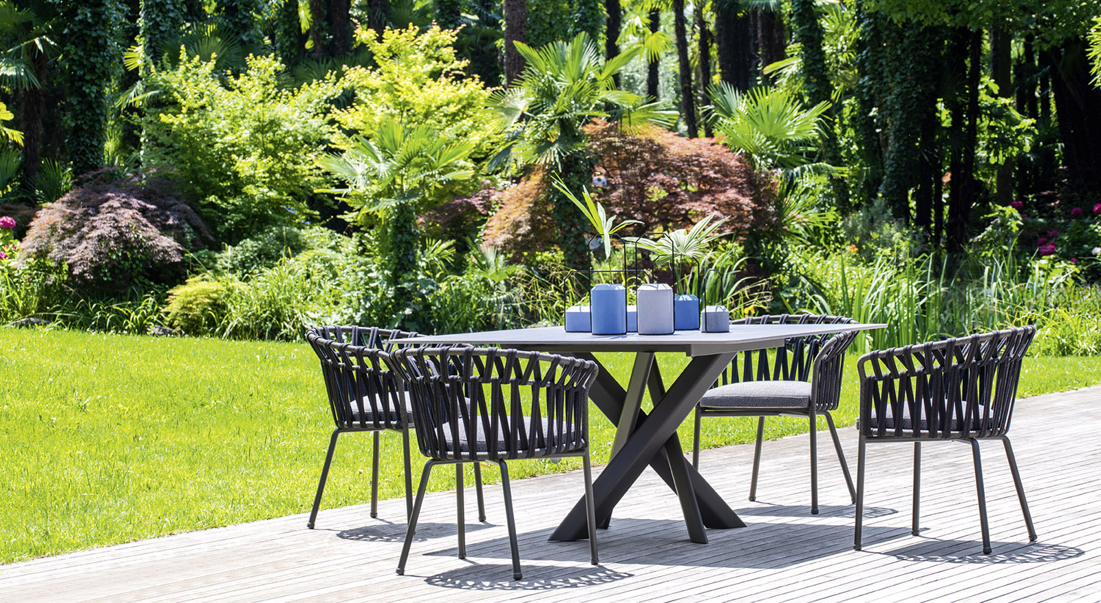nspired by the corolla of a flower, Emma Cross armchair has an enveloping design, which welcomes and relaxes.The band in acrylic fabric overlaps the rope weaving that covers the aluminum frame, drawing the surface of the backrest with diagonal lines. A double weaving that becomes an iconic motif of this elegant armchair for the outdoors.The chromatic selection for Emma Cross gives life to a fresh and stylish proposal, perfect for both residential and contract spaces.