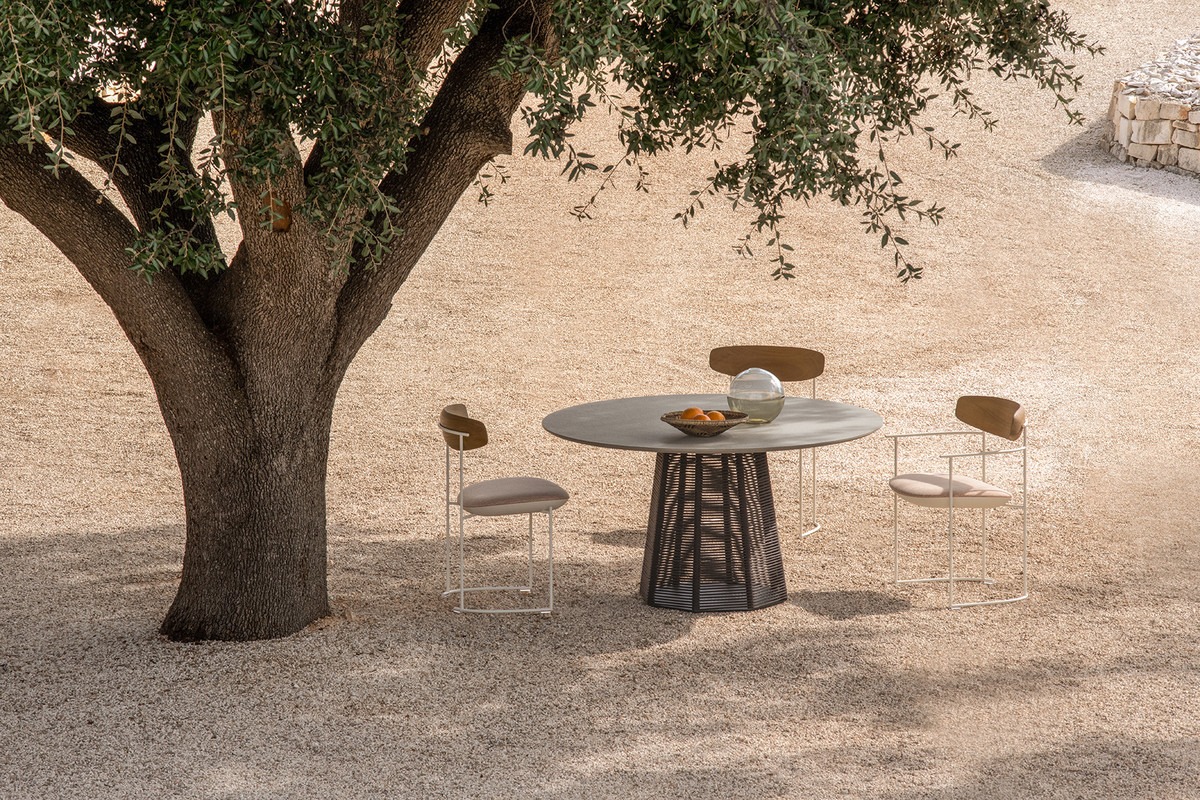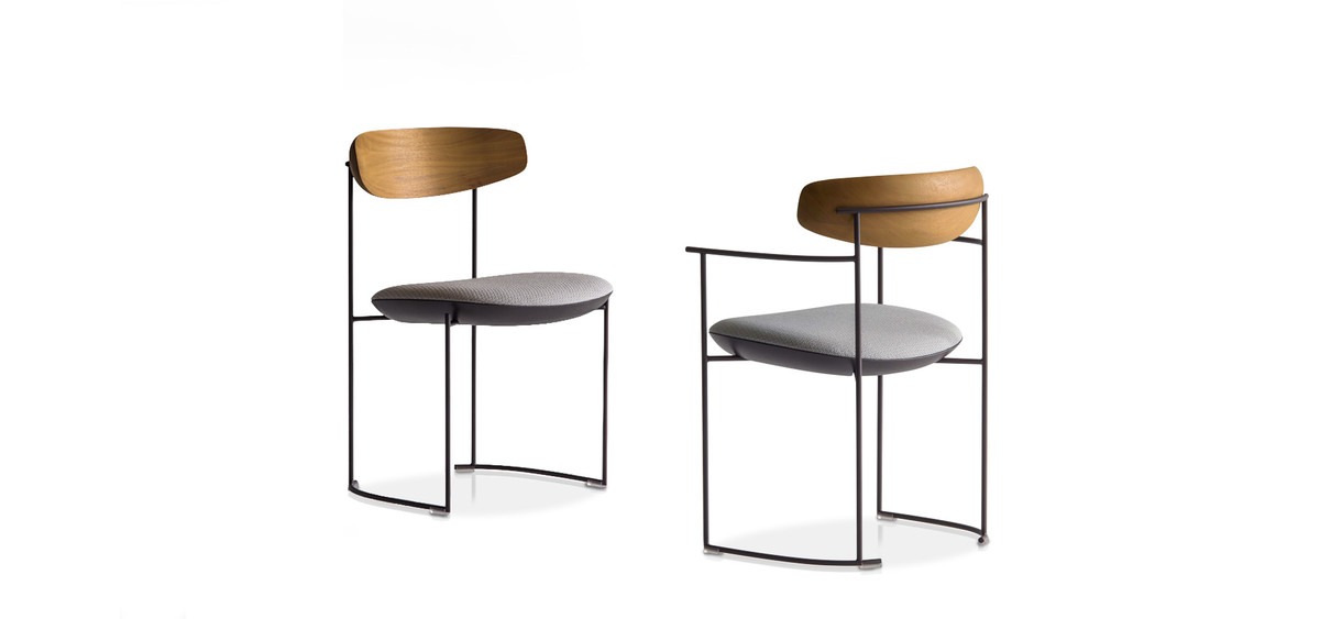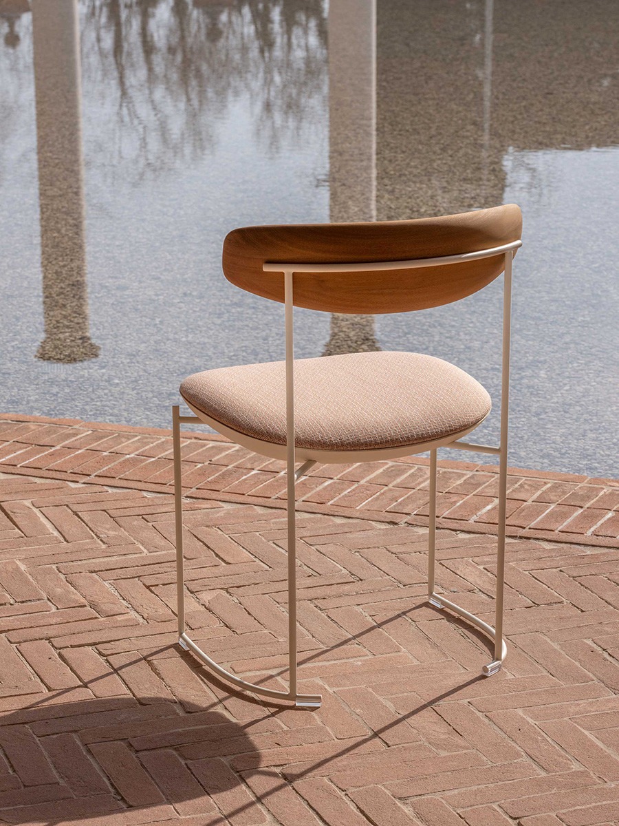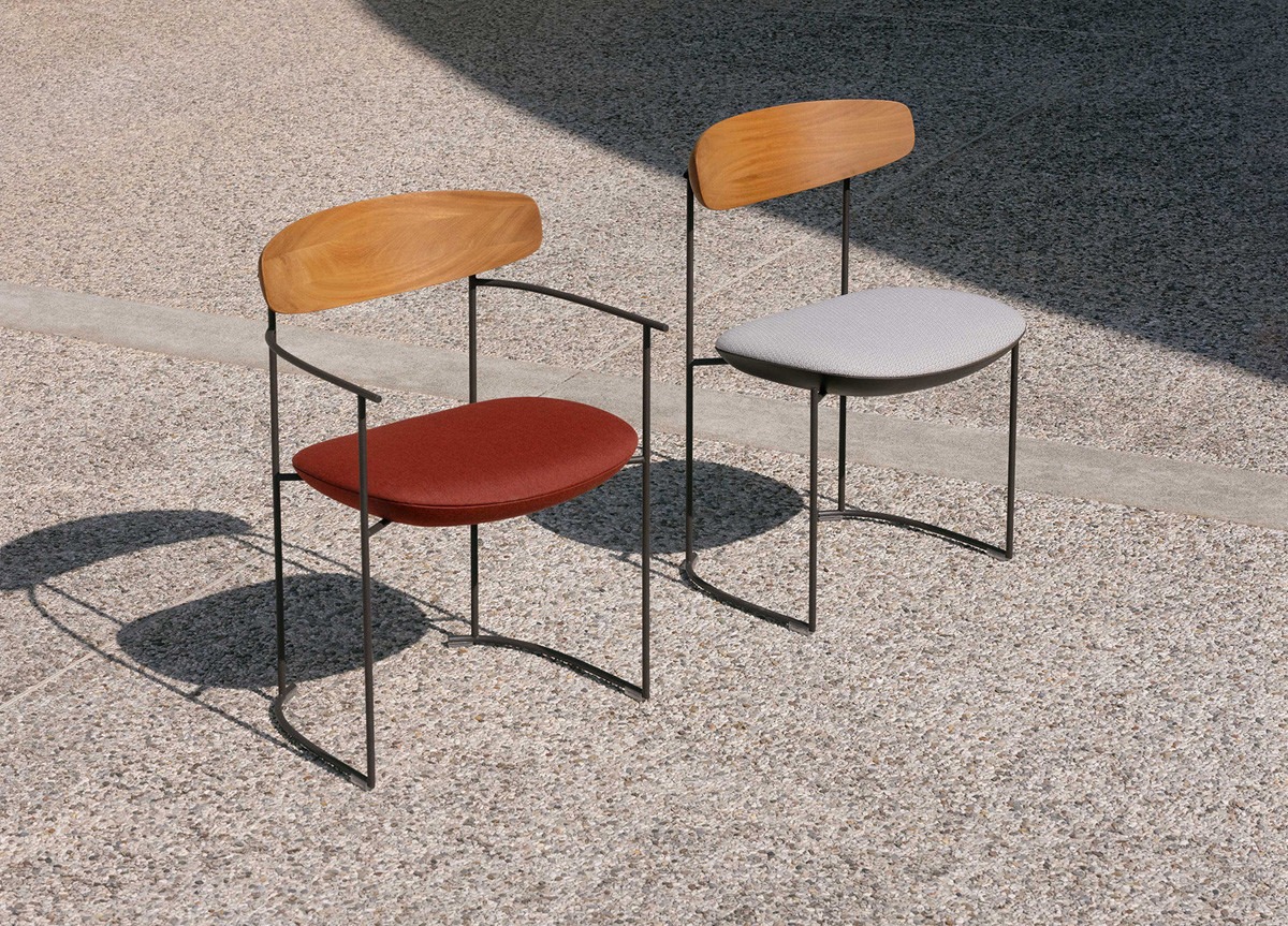 The Keel Light chair and small armchair, extension of the homonymous collection, are the result of the research between geometric rigor and organic sinuosity.Available in both solutions, for indoor and outdoor, Keel Light come with a solid Iroko wood backrest, a structure in embossed metal rod painted with epoxy powders in anthracite and aval finishes, and a padded seat with a rigid underlying shell, acrylic painted for outdoors, in the same color and fine embossing of the structure.The silhouette of the seat, which maintains its origins and inspiration from the nautical world, is revealed with even greater aesthetic and technical evidence.