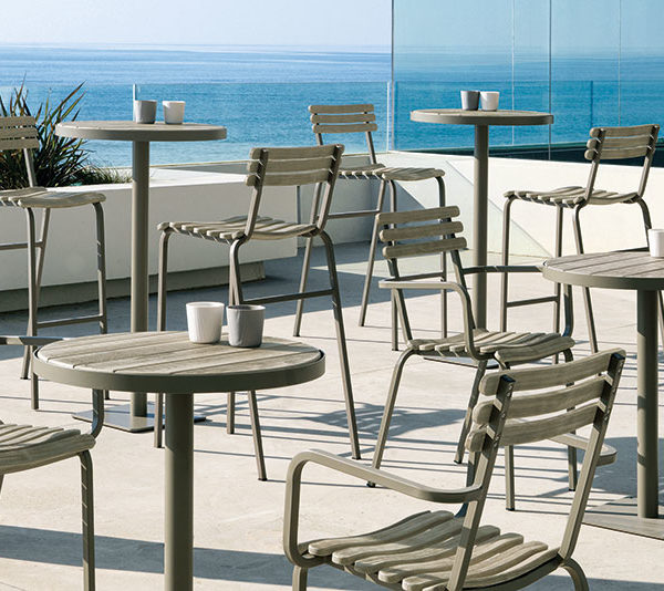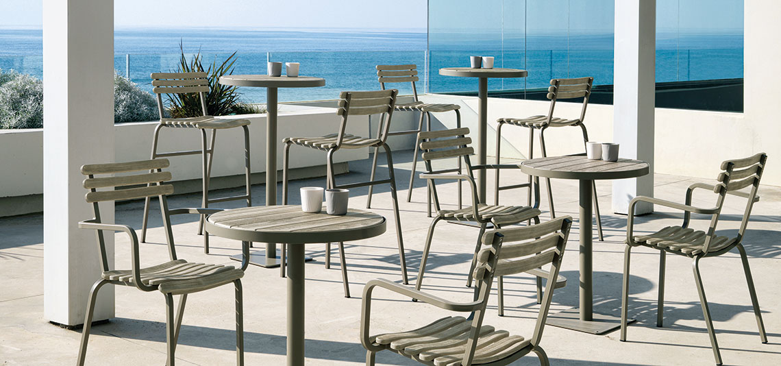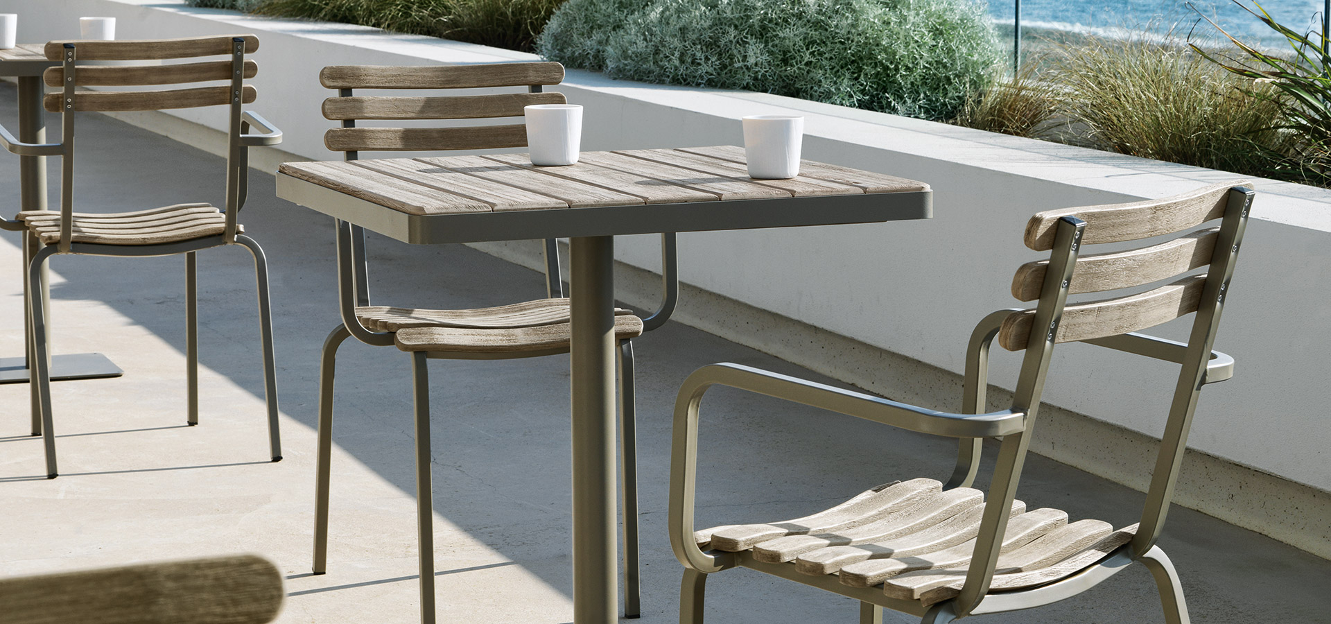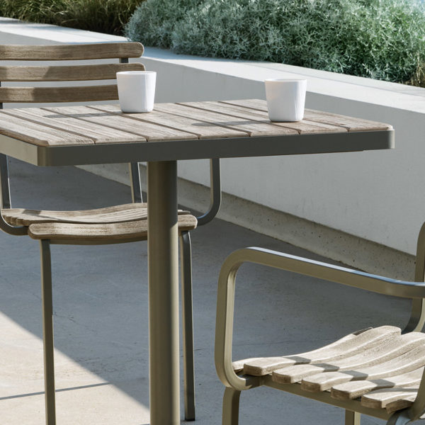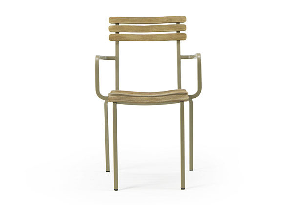 LAREN STACKING DINING ARMCHAIR WITH MUD GREY METAL FRAME AND PICKLED TEAK SLATS