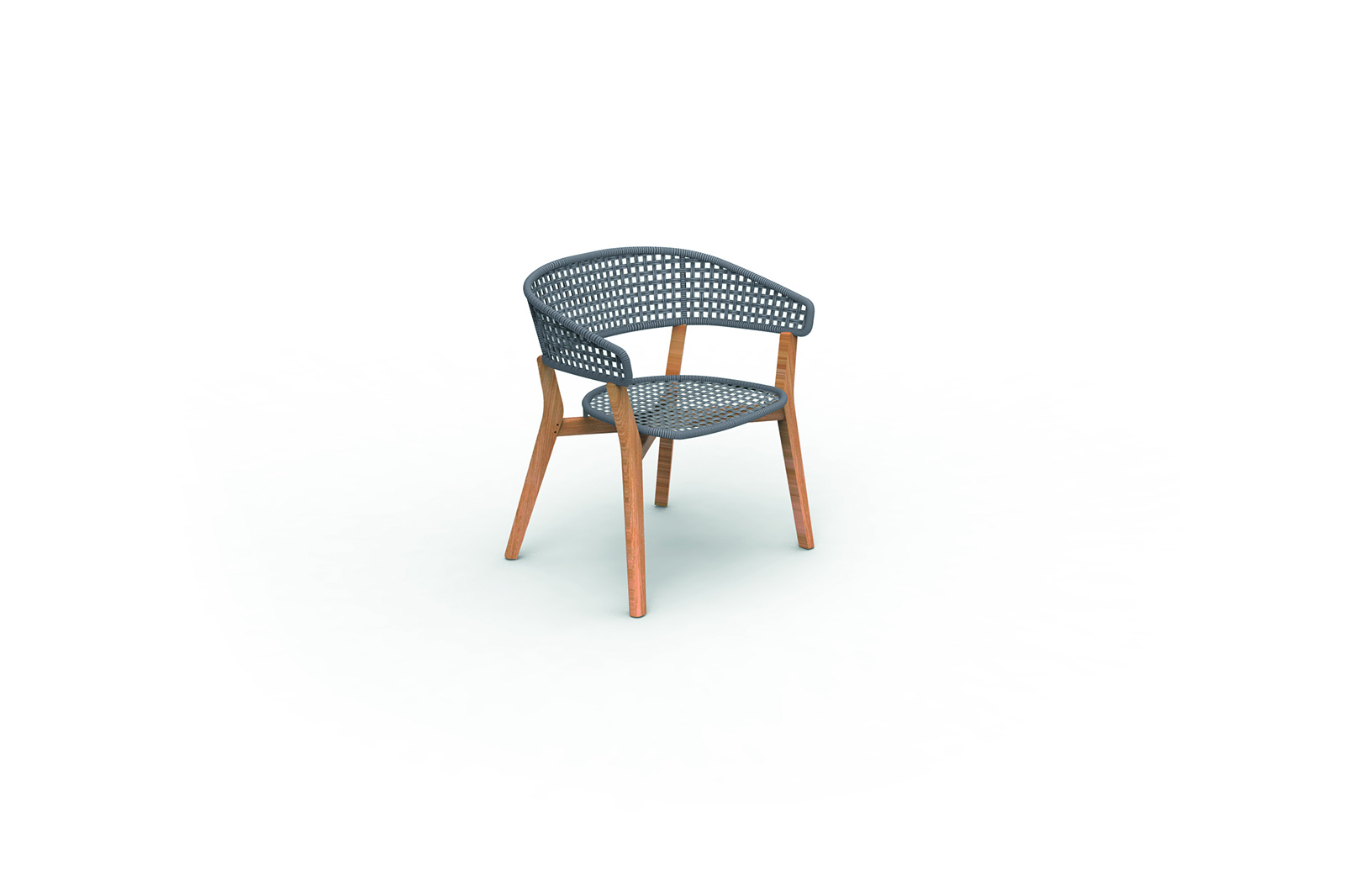 Together with the dining table it creates a soft but impact atmosphere. It has a natural teak structure with armrests and backrests in tubular aluminium covered with an intertwining of ropes in grey synthetic fabric.