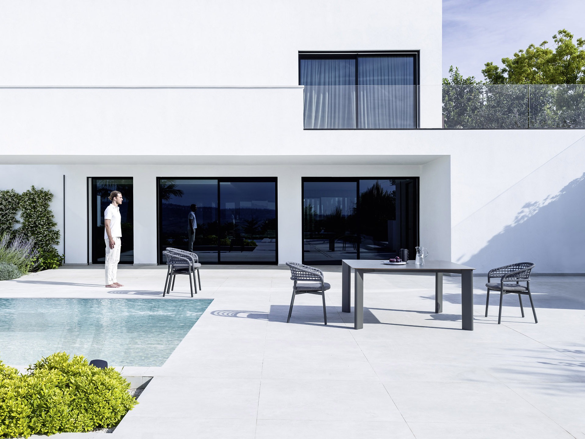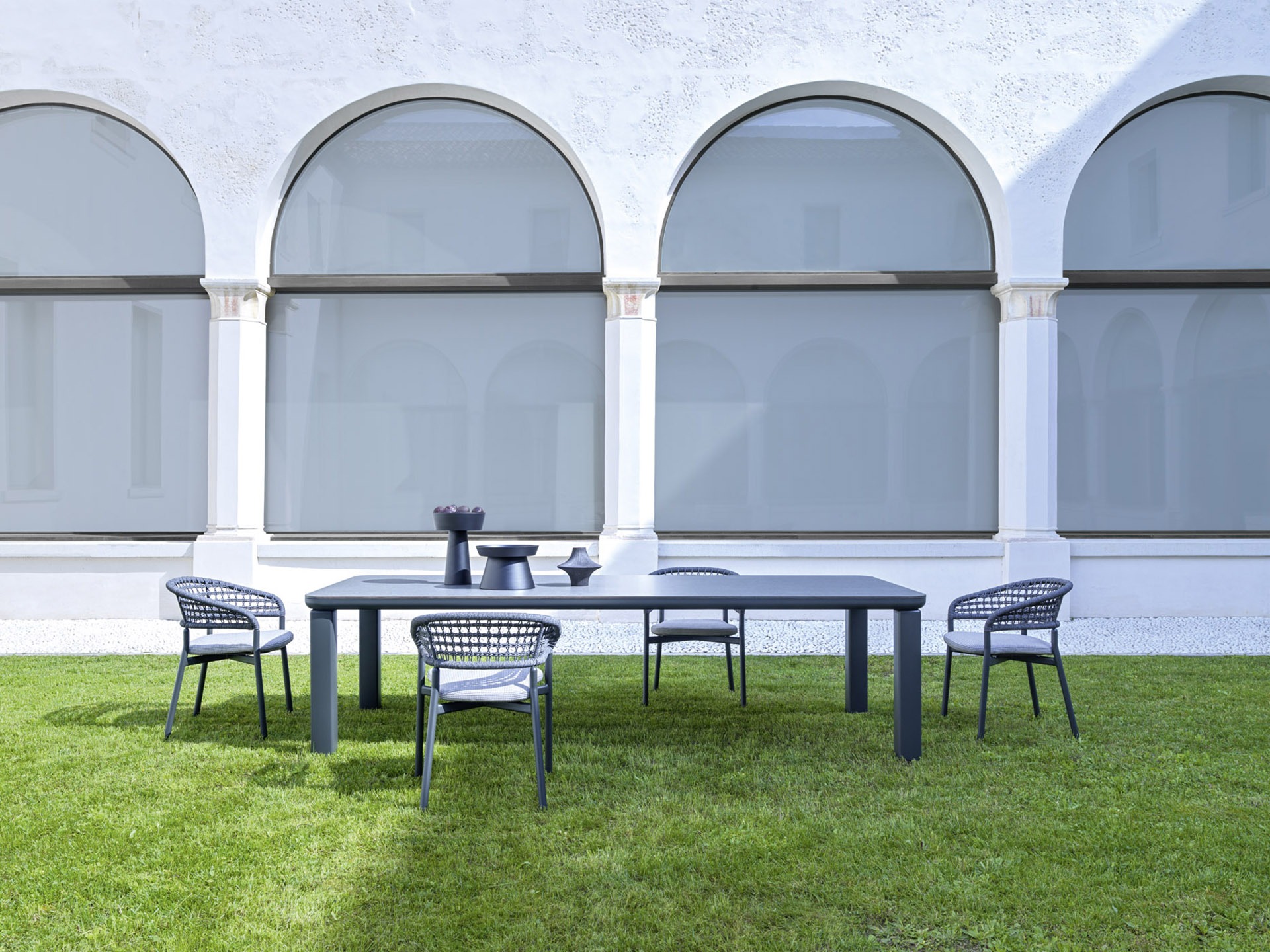 Architects Pio and Tito Toso’s table bases Collection has been widened with the addition of a dining armchair available in two versions, both made of powder-coated aluminum and with a comfortable and elegant backrest, made of synthetic fiber.