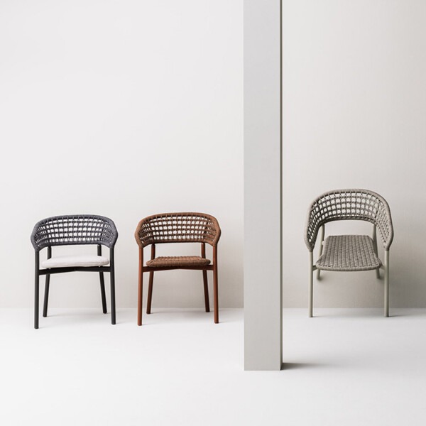 The first version is a woven seat, made of powder-coated aluminum tube covered by a rope weaving; the second option is even more comfortable thanks to the addition of a removable cushion cover that can be easily removed and washed.