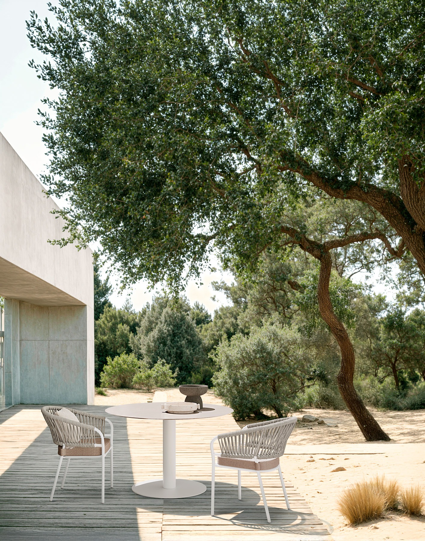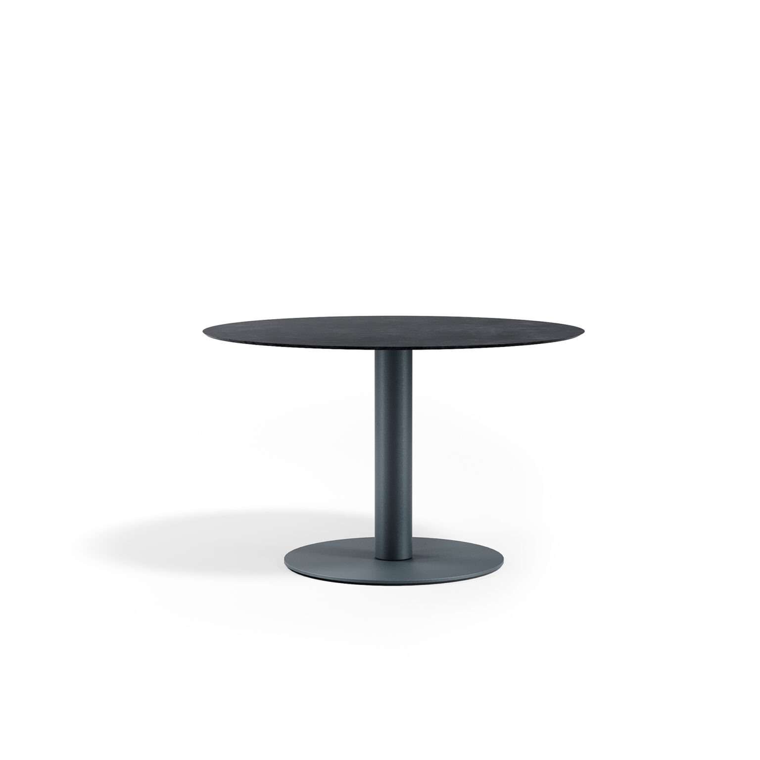 Round dining table, featuring a solid and versatile base available in three different finishes. The top, made of gres or HPL, provides a durable and refined surface that is also easy to maintain.