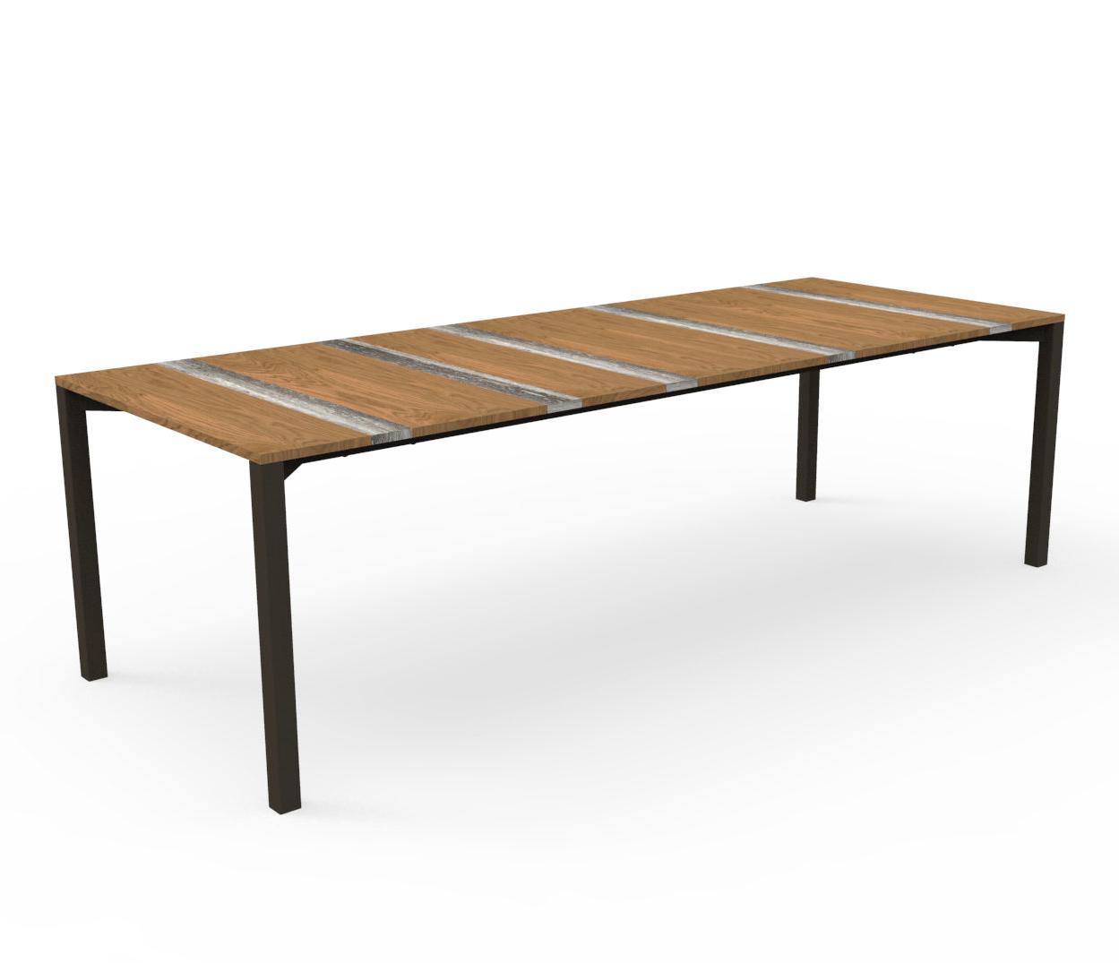 The casilda dining table 260×100 with a stainless steal frame powder coated and iroko wood top is combined with marble slat according to the colour base.