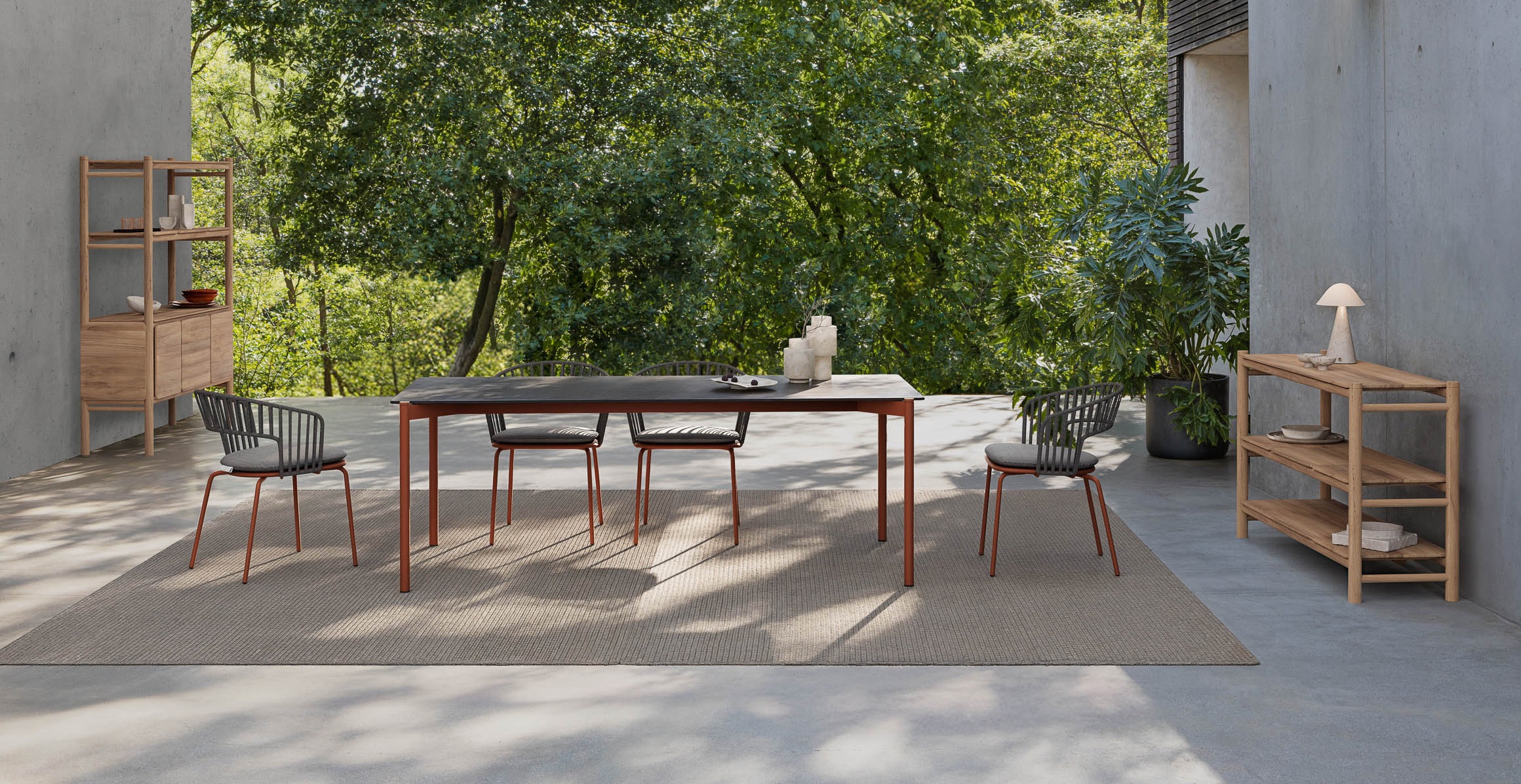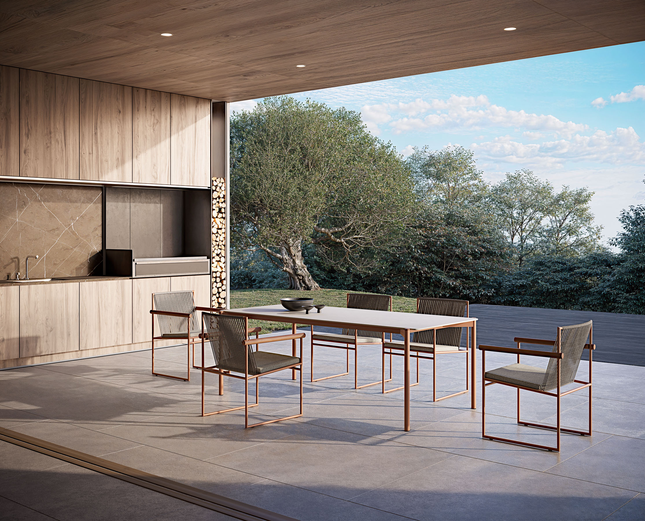 Heritage Table combines modern aesthetics with high-quality materials. The top, available in gres or HPL in various finishes, ensures durability and versatility. The cylindrical aluminum legs in terracotta color, enhanced with teak details on the upper part, add warmth and refinement to a minimalist and contemporary design.