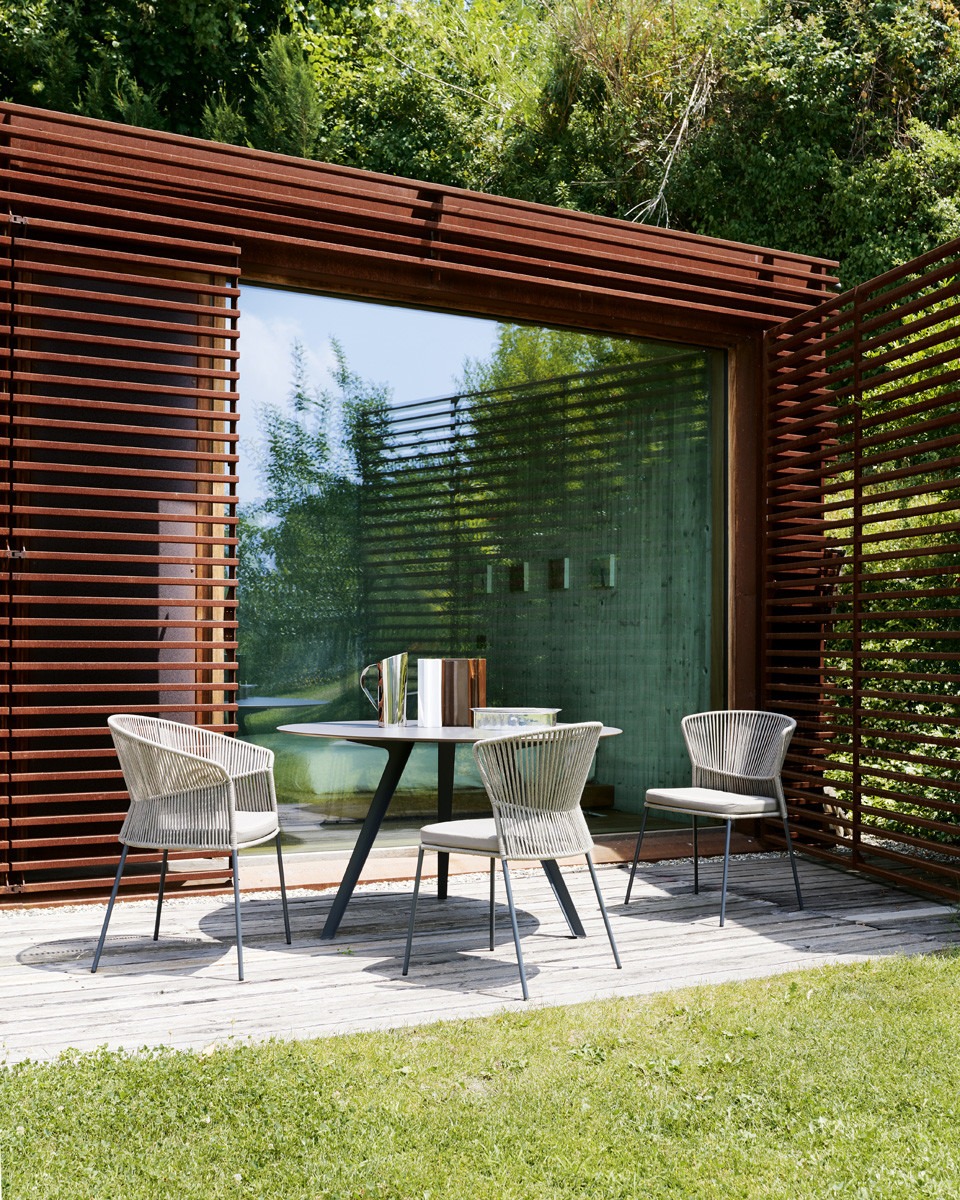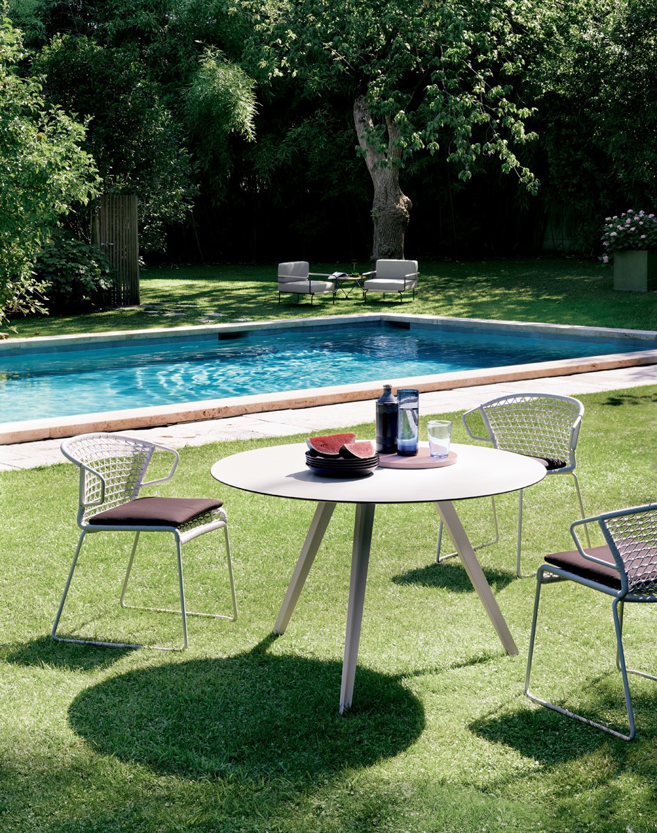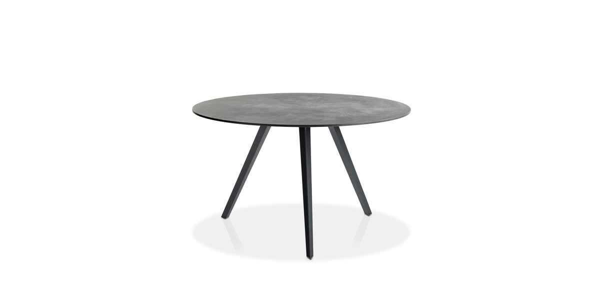 The uniqueness of the Katana table is determined by the peculiar design of the metal legs, which recalls the ancient Japanese curved blade swords from which the product takes its name.Katana is a table designed to adapt to both domestic interiors and open-air contexts, proposed in a version with three legs in embossed painted metal and a ⌀120 e ⌀130 cm round top in laminated porcelain or HPL, in the finishes as per collection.