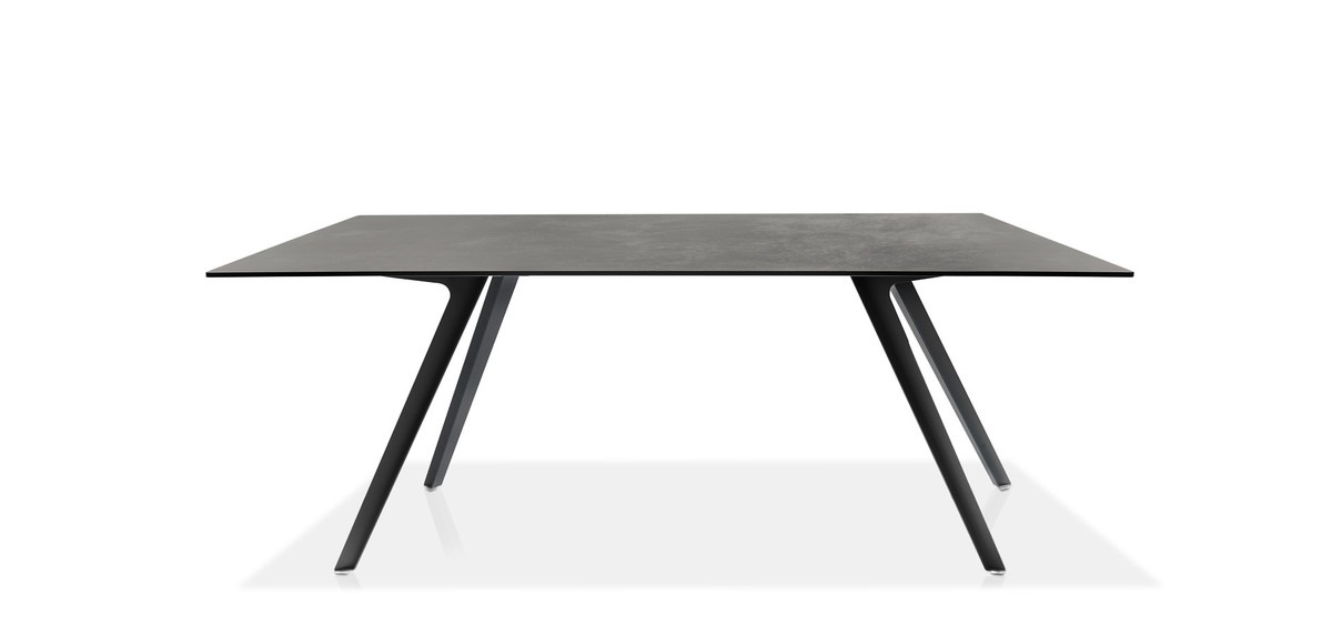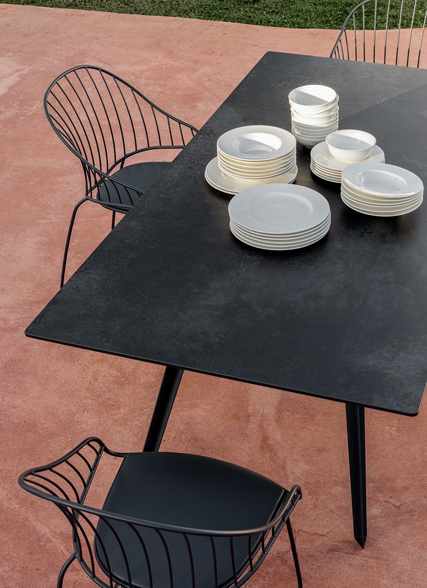 The uniqueness of the Katana table is determined by the peculiar design of the metal legs, which recalls the ancient Japanese curved blade swords from which the product takes its name.Katana is a table designed to adapt to both domestic interiors and open-air contexts, proposed in a version with four legs in embossed painted metal and rectangular top in laminated porcelain or HPL, in the finishes as per collection.