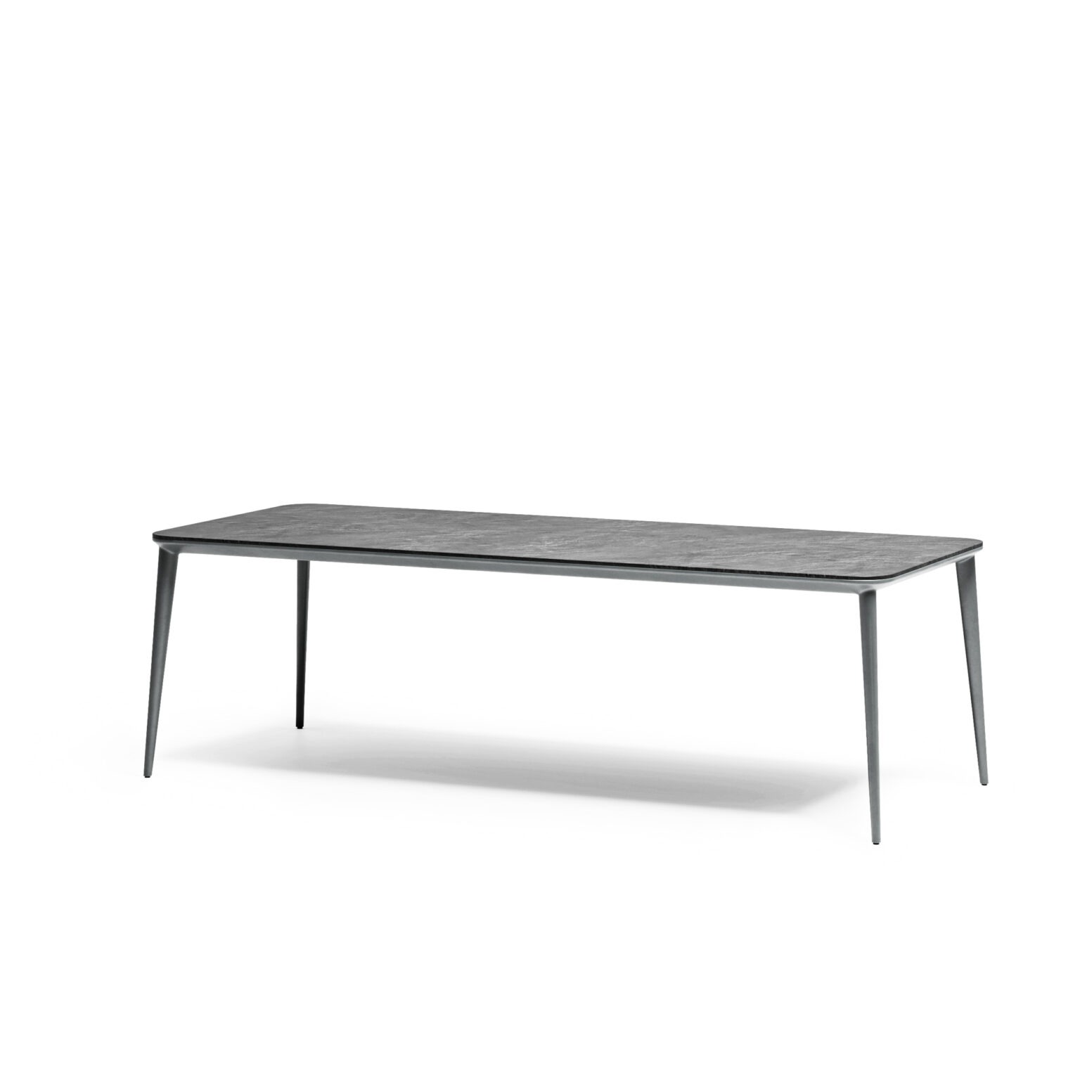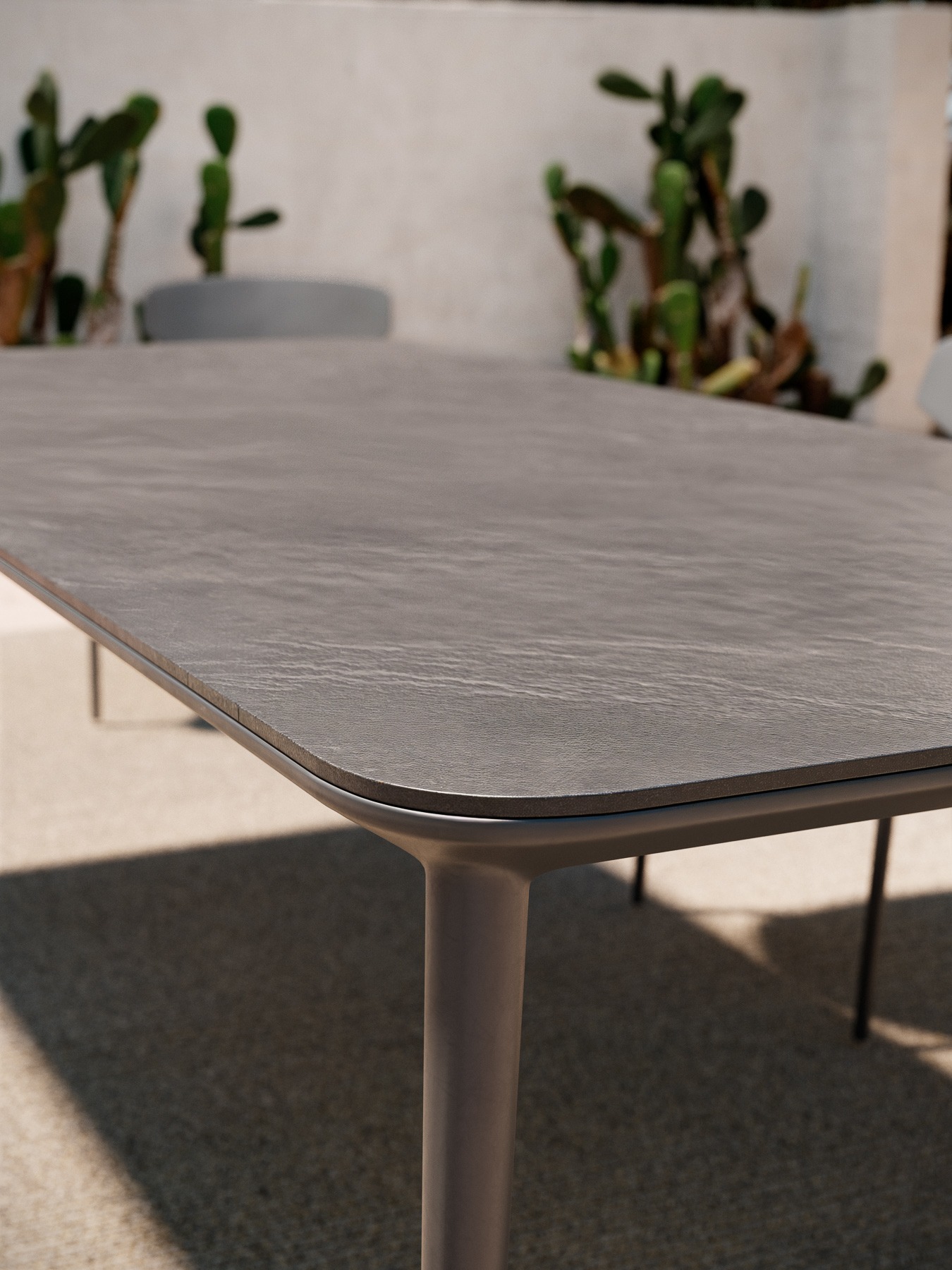 Thin and conical lines characterize the Origami table, composed of an aluminum structure combined with a gres top.