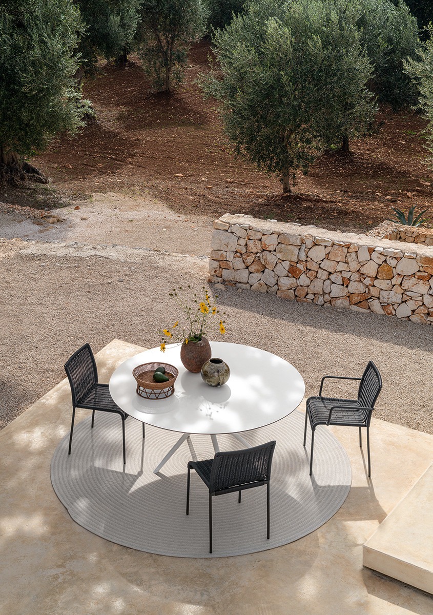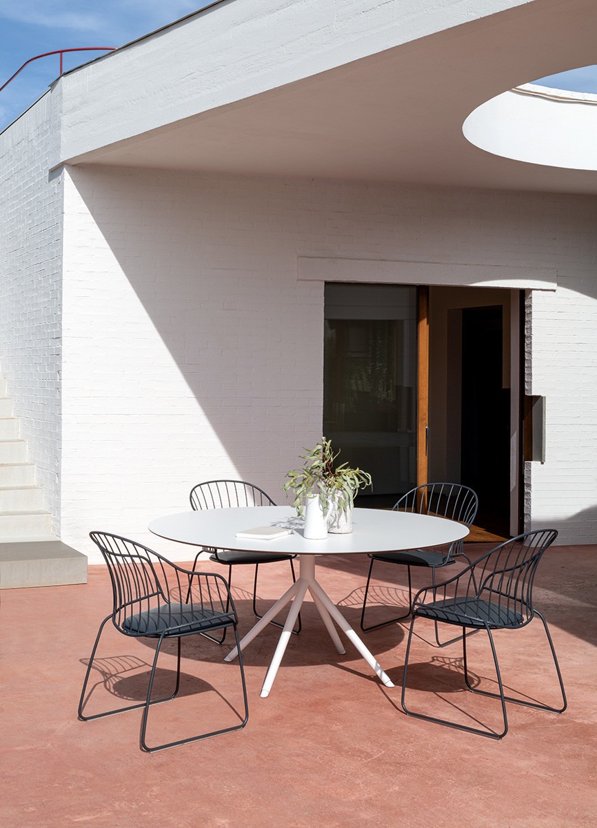 Versatile and with an essential design, the OTX table with central leg and four feet, is declined in the dining version Ø128 e Ø158cm, with painted metal base and HPL top in the finishes as per collection.