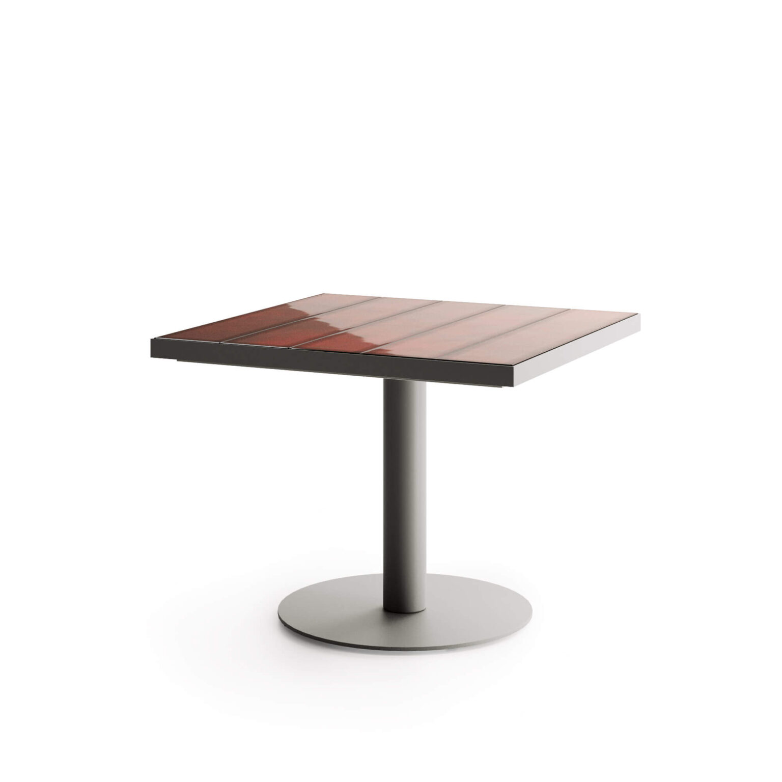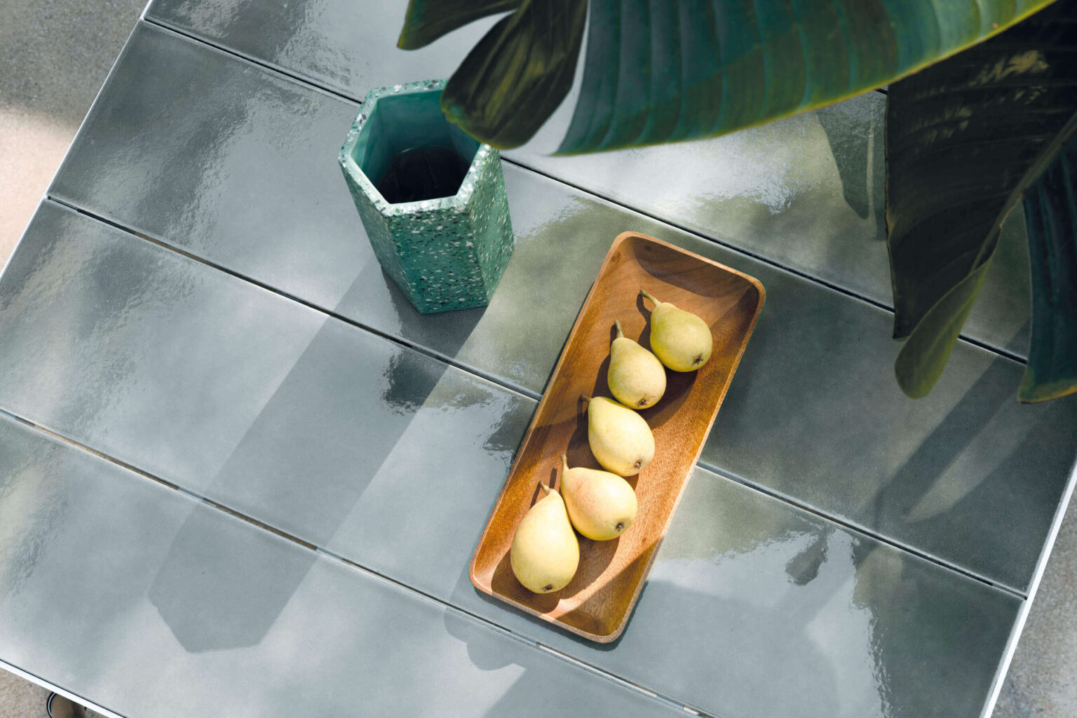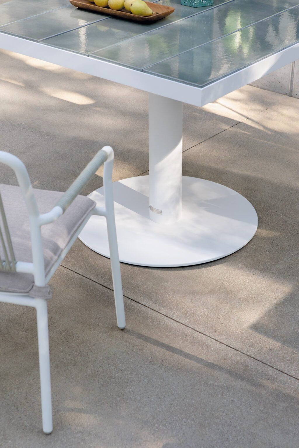 A sumptuous meal in company is recalled by Pantagruel: a refined elegance seeps through the table top, made of glazed ceramic in enveloping colours, combined with a solid white or graphite aluminium base.