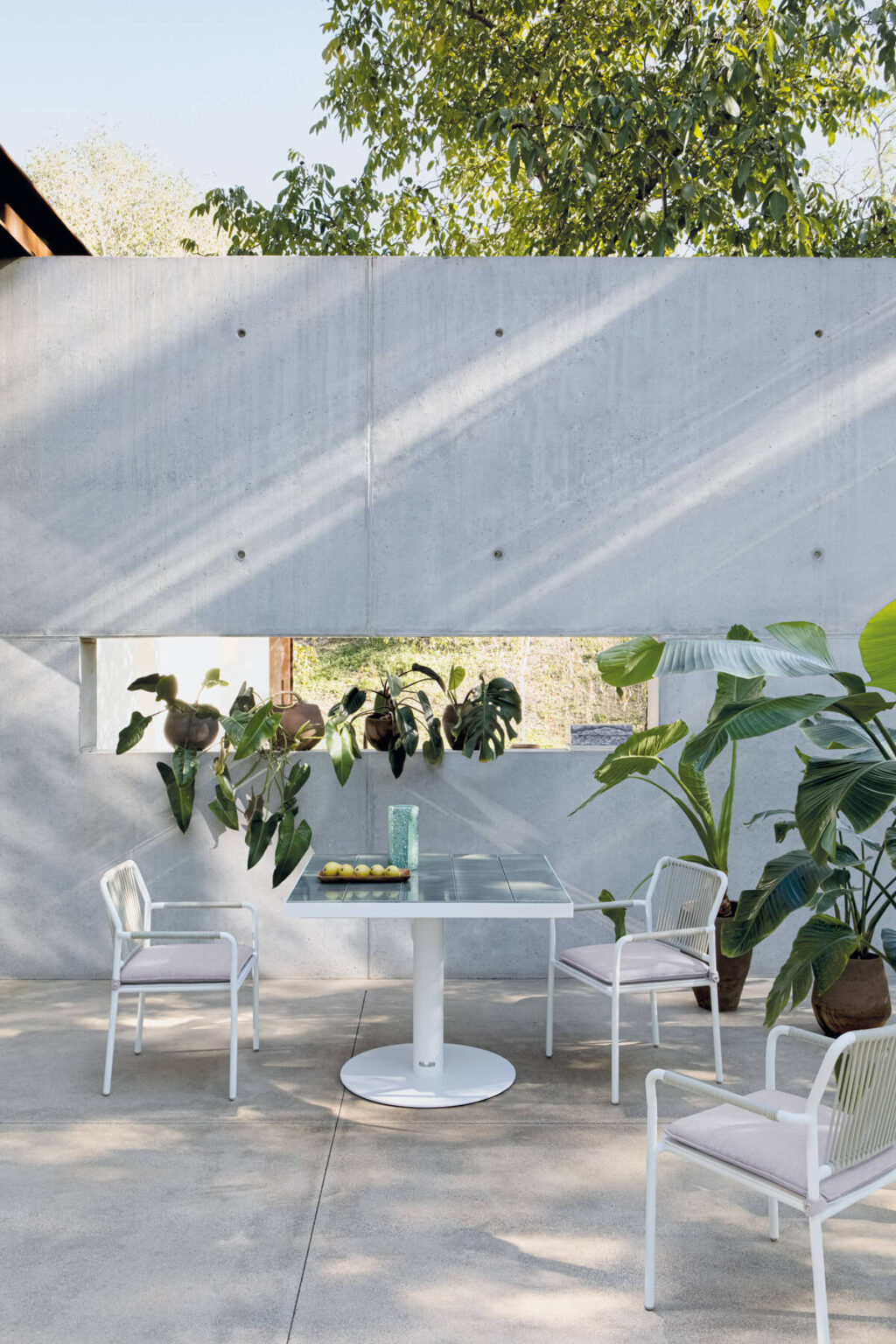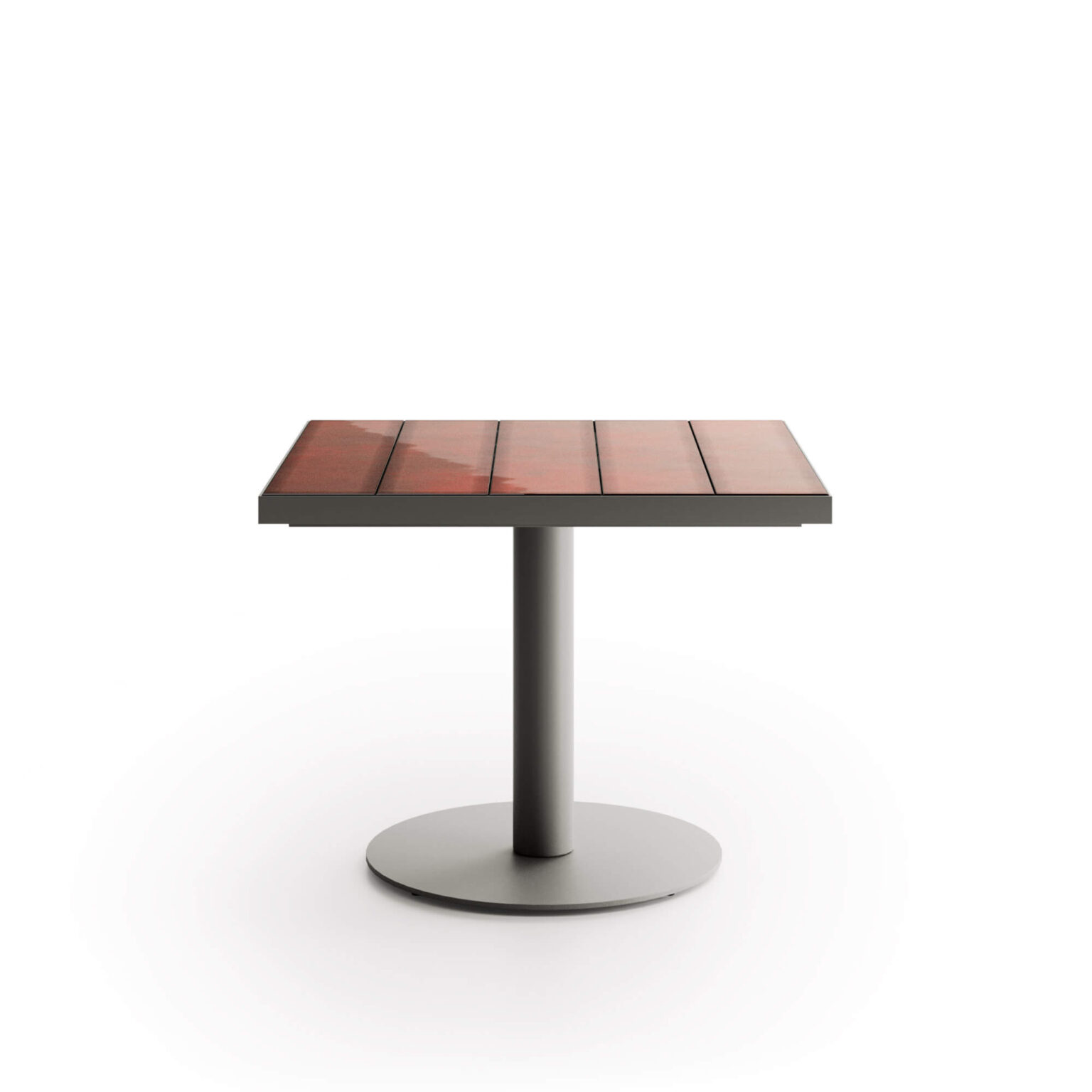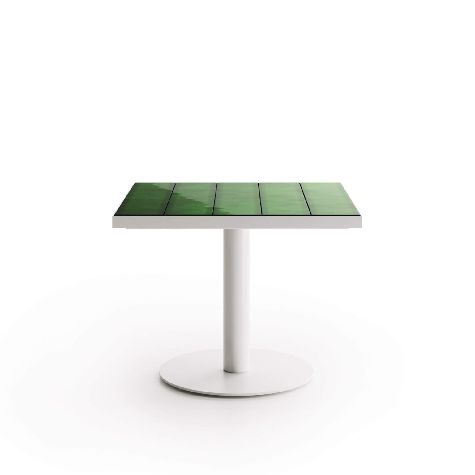 A sumptuous meal in company is recalled by Pantagruel: a refined elegance seeps through the table top, made of glazed ceramic in enveloping colours, combined with a solid white or graphite aluminium base.