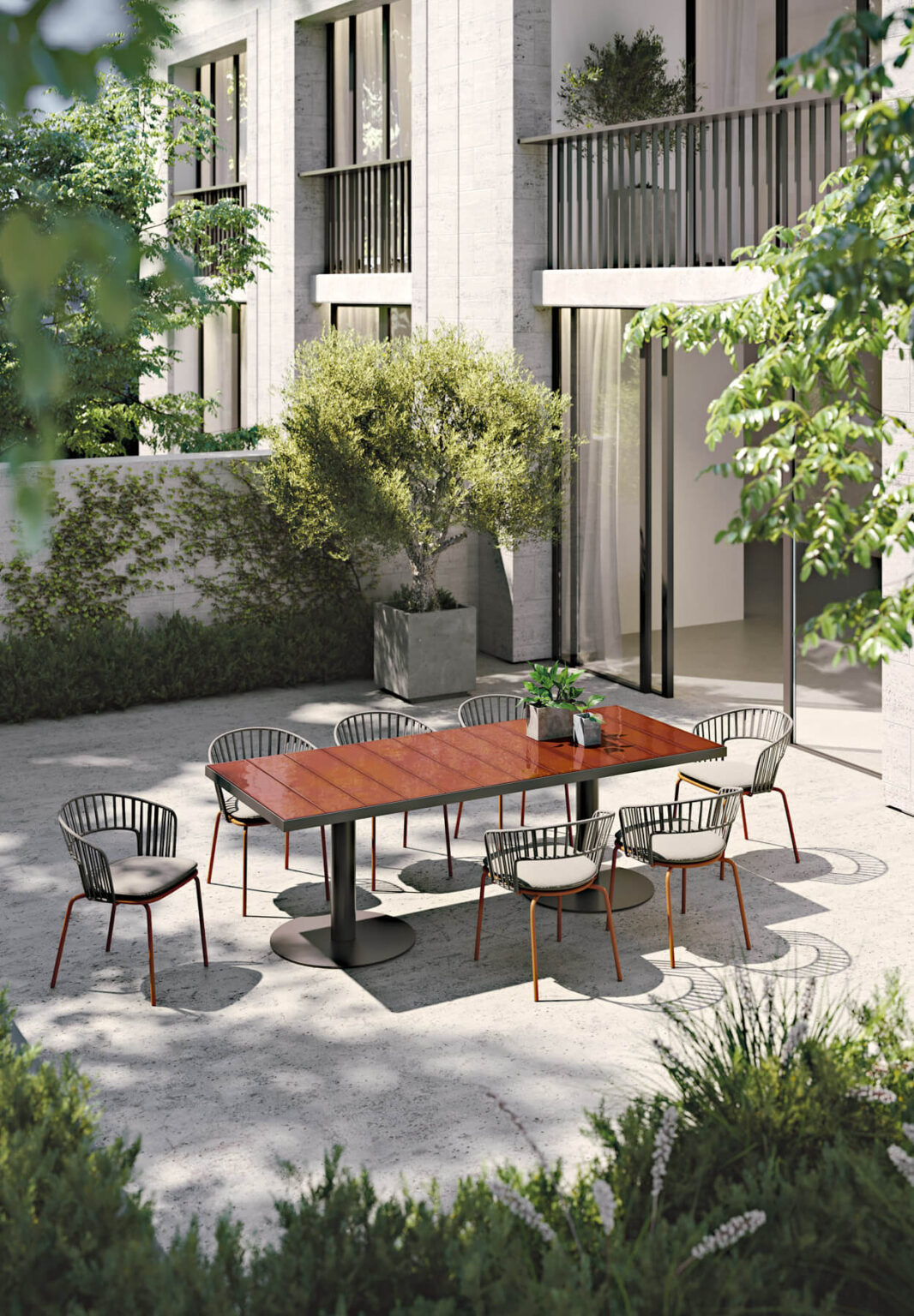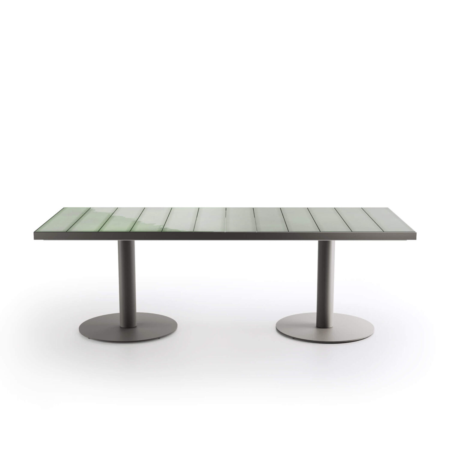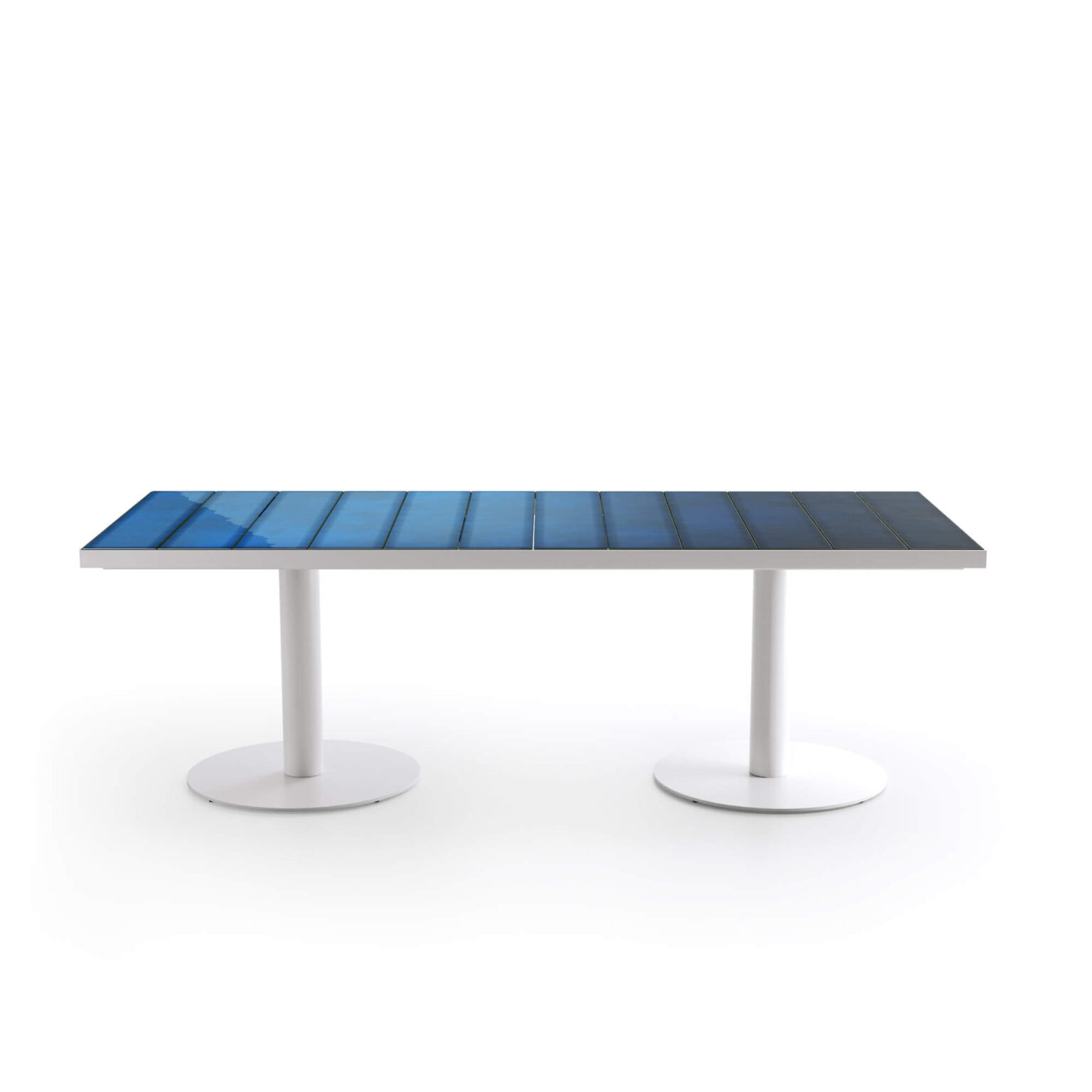 A sumptuous meal in company is recalled by Pantagruel: a refined elegance seeps through the table top, made of glazed ceramic in enveloping colours, combined with a solid white or graphite aluminium base.