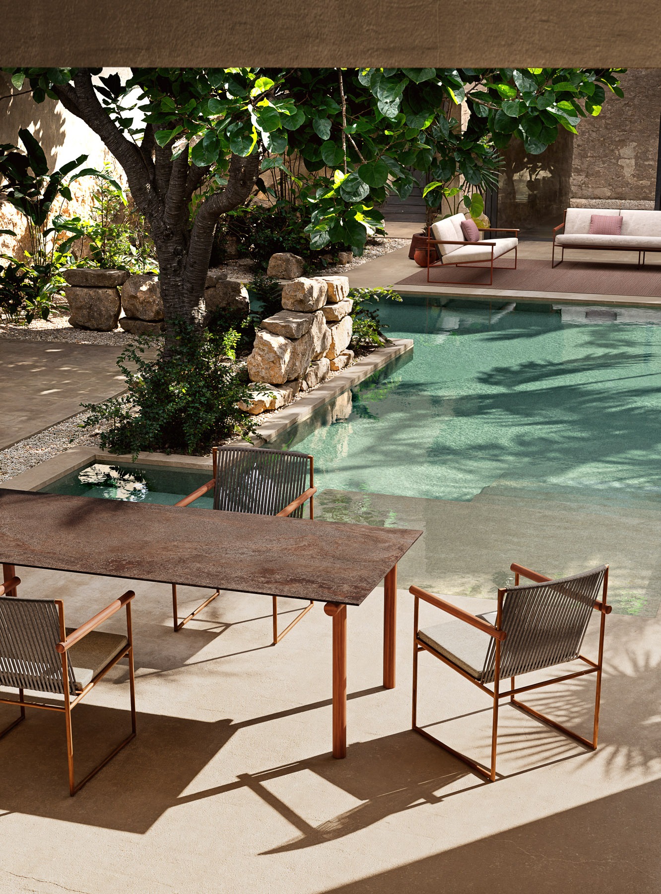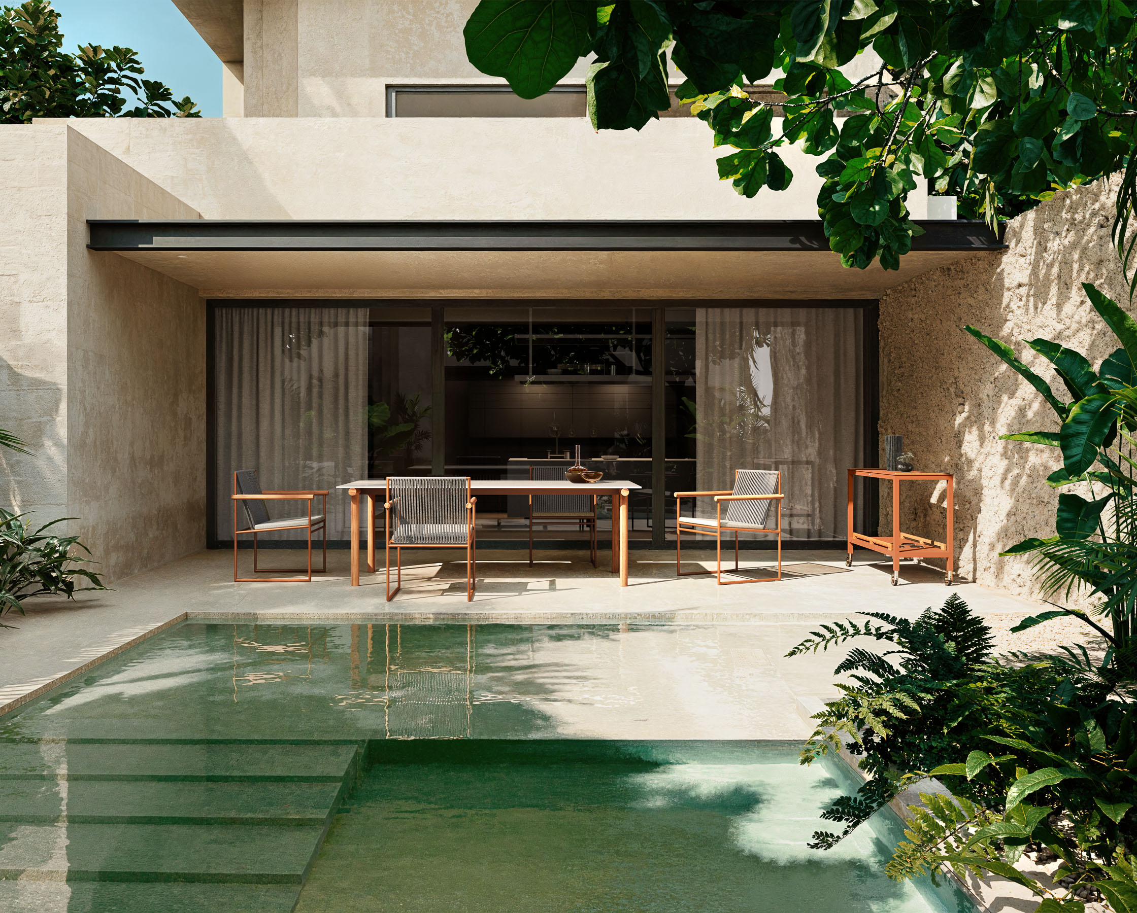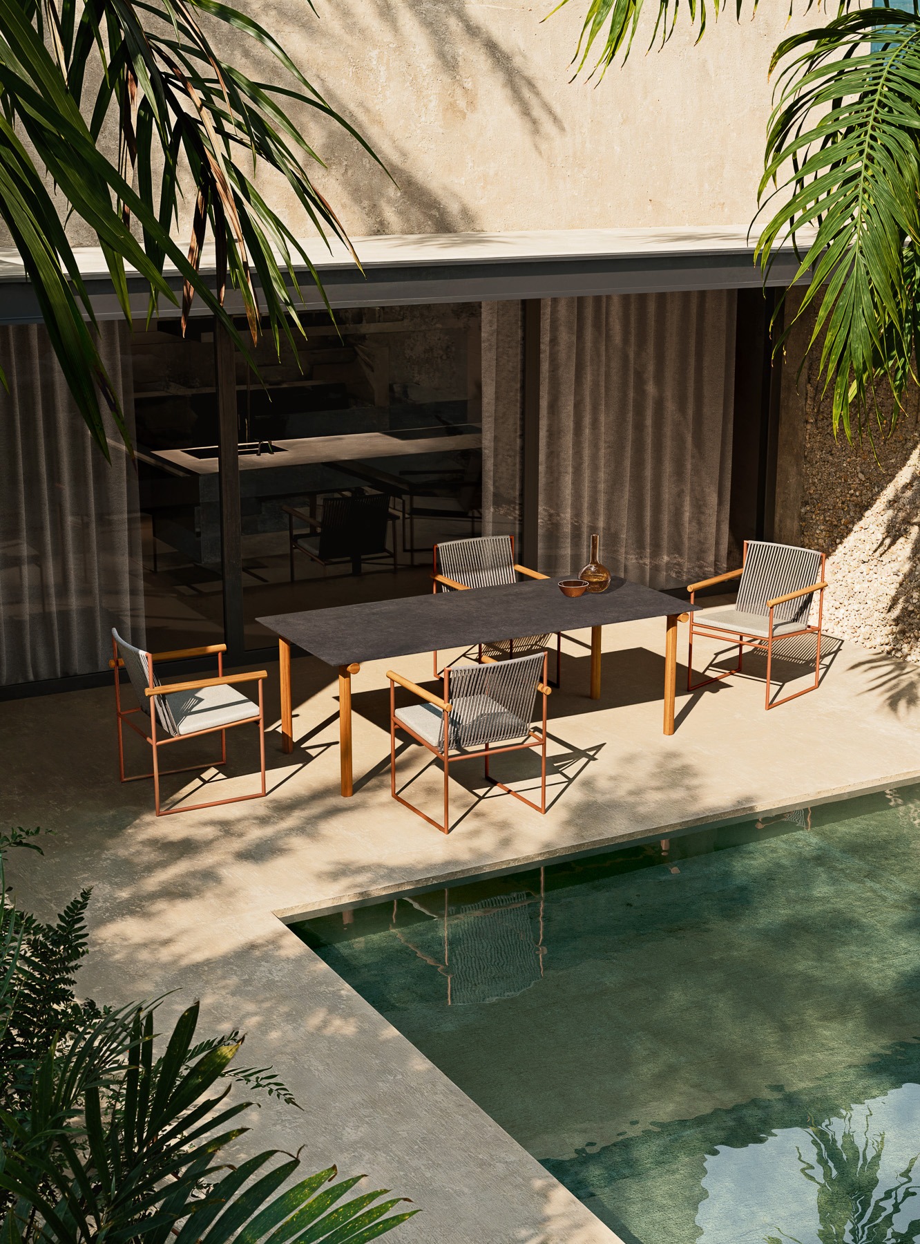 The PIPE dining table features bold geometries, with tubular legs in solid Asian teak that combine sturdiness with natural elegance. The gres top, available in three different finishes, provides a durable and easy-to-maintain surface, enriching the space with a touch of refinement and timeless style.