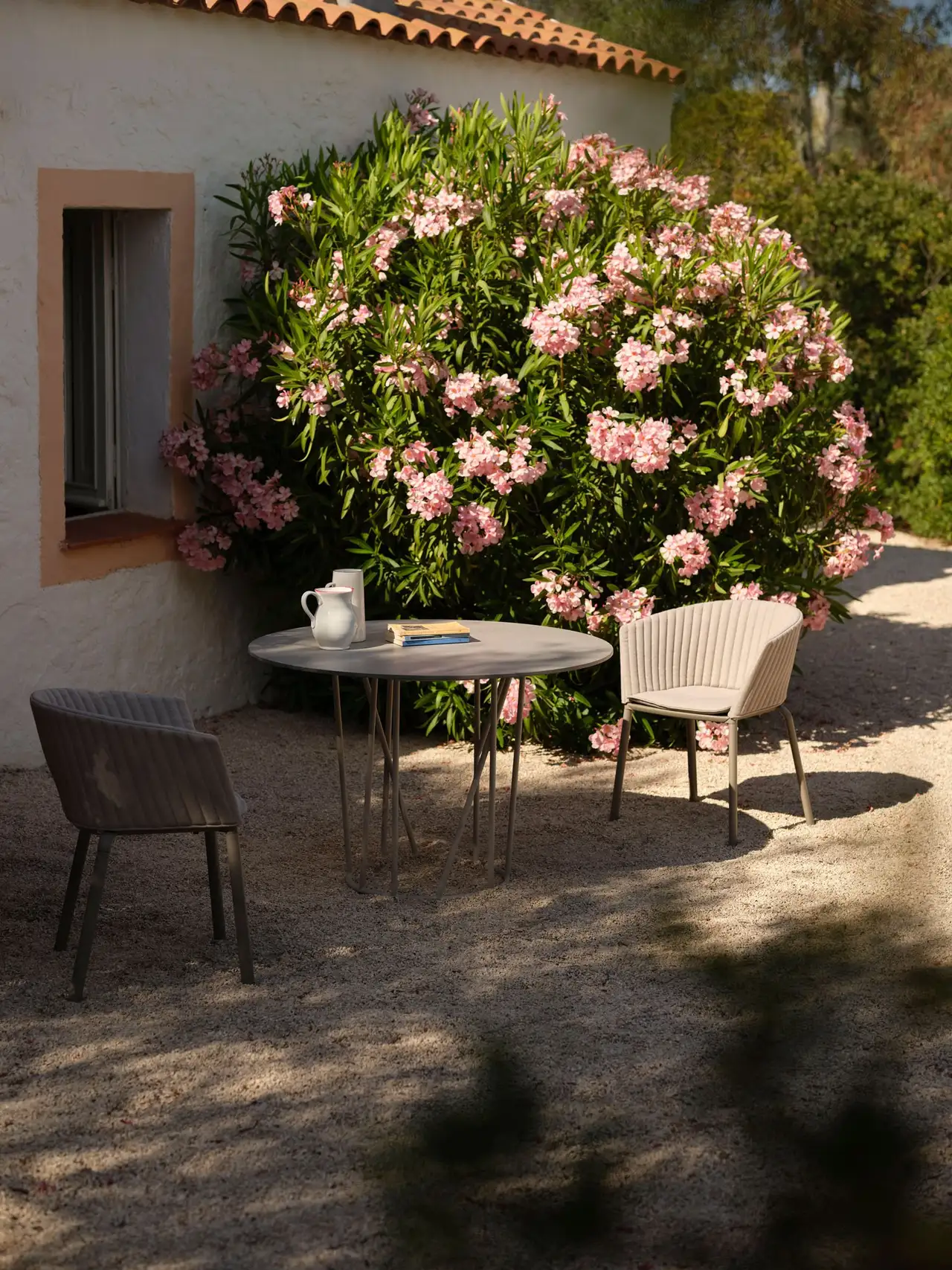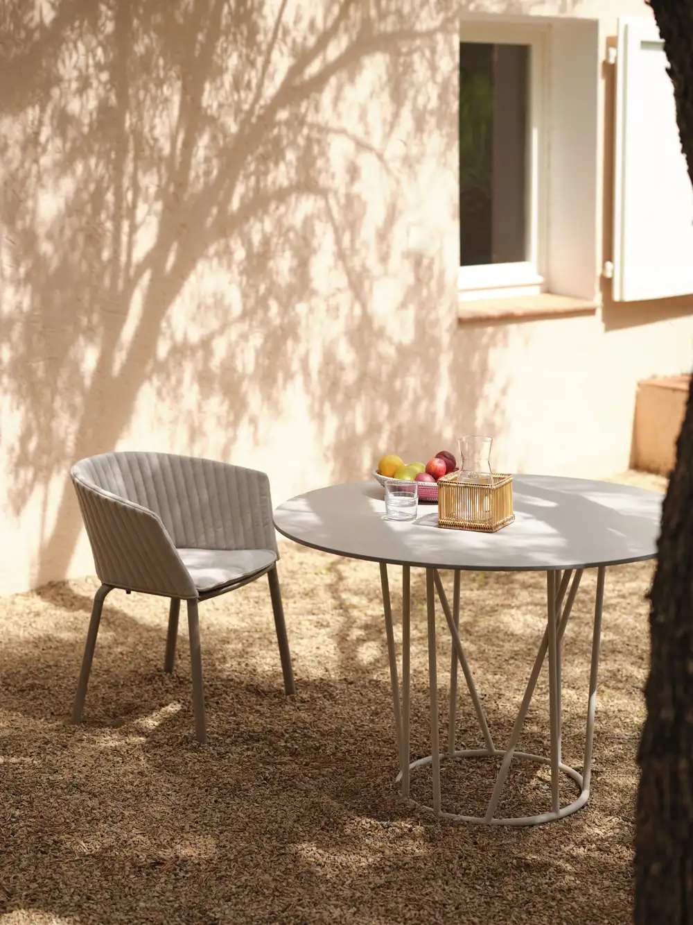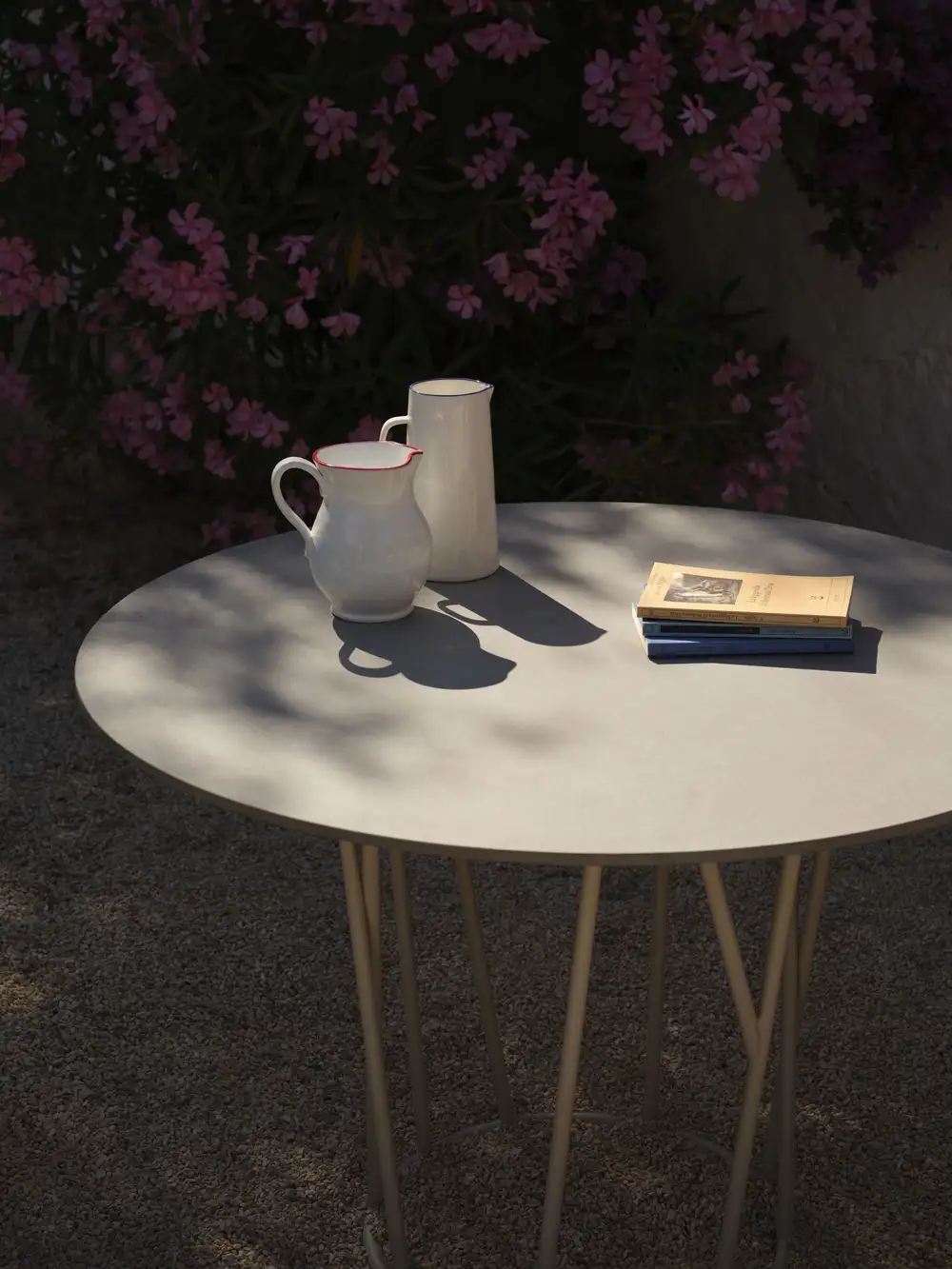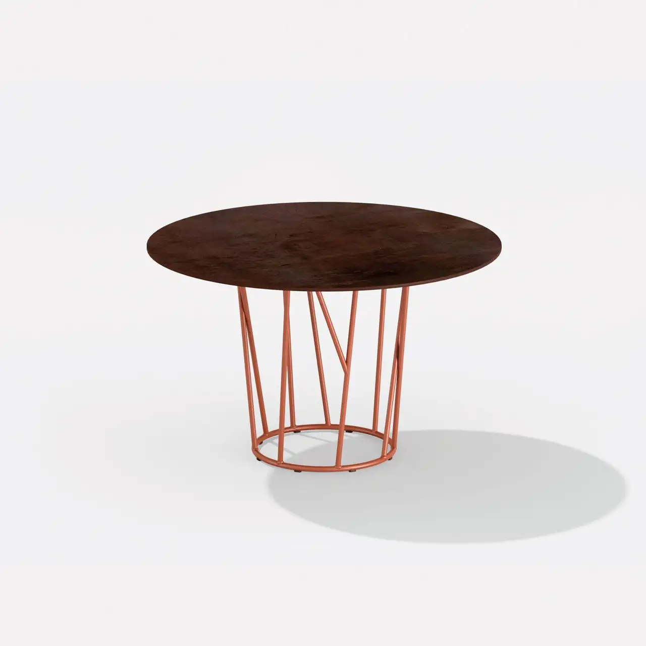 Round table in painted aluminium with top in porcelain stoneware