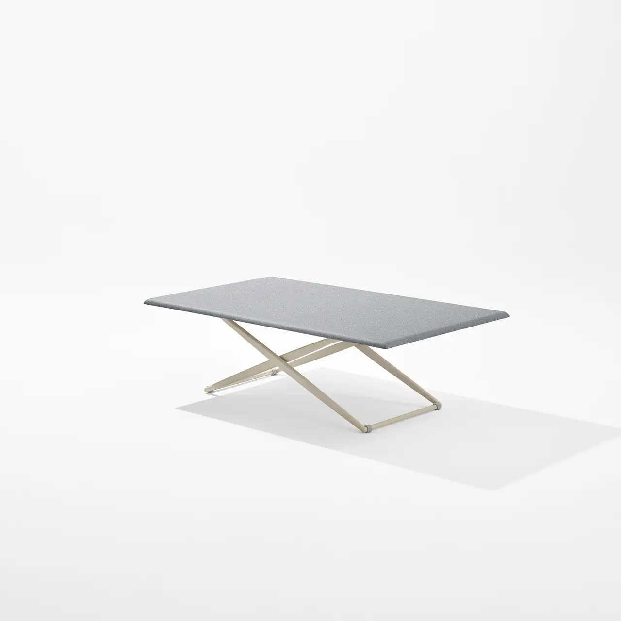 Rectangular Up&Down table with three adjustable heights in painted aluminium with top in speckled aluminium. Base on wheels