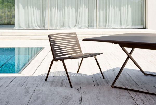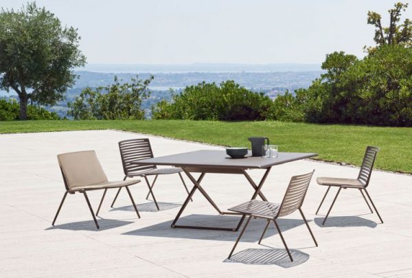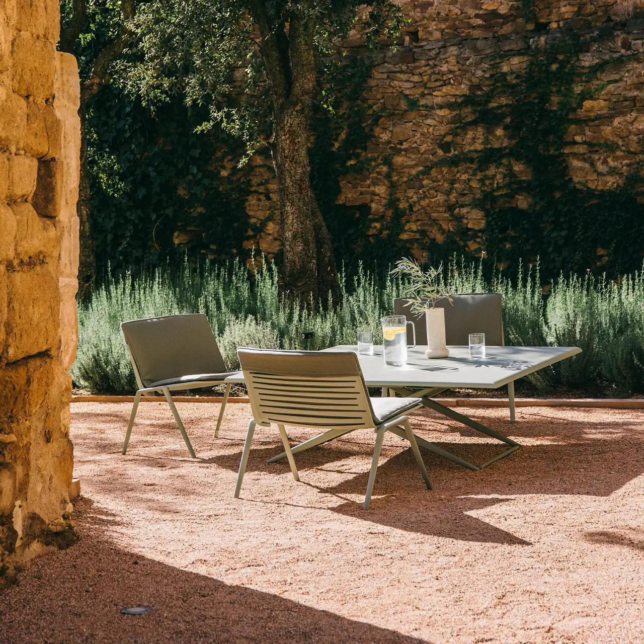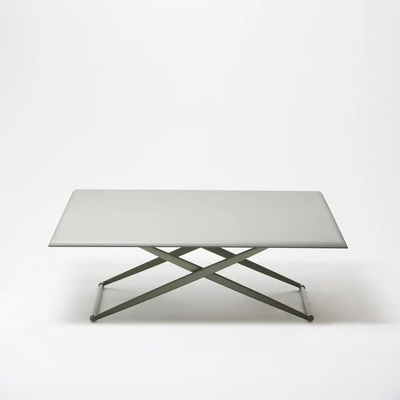 Square Up&Down table with three adjustable heights in painted aluminium with top in speckled aluminium. Base on wheels