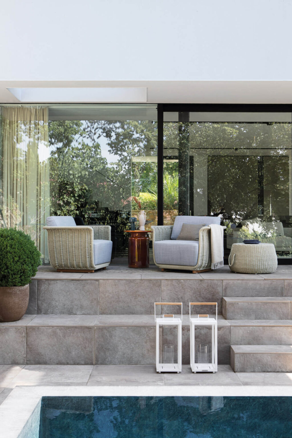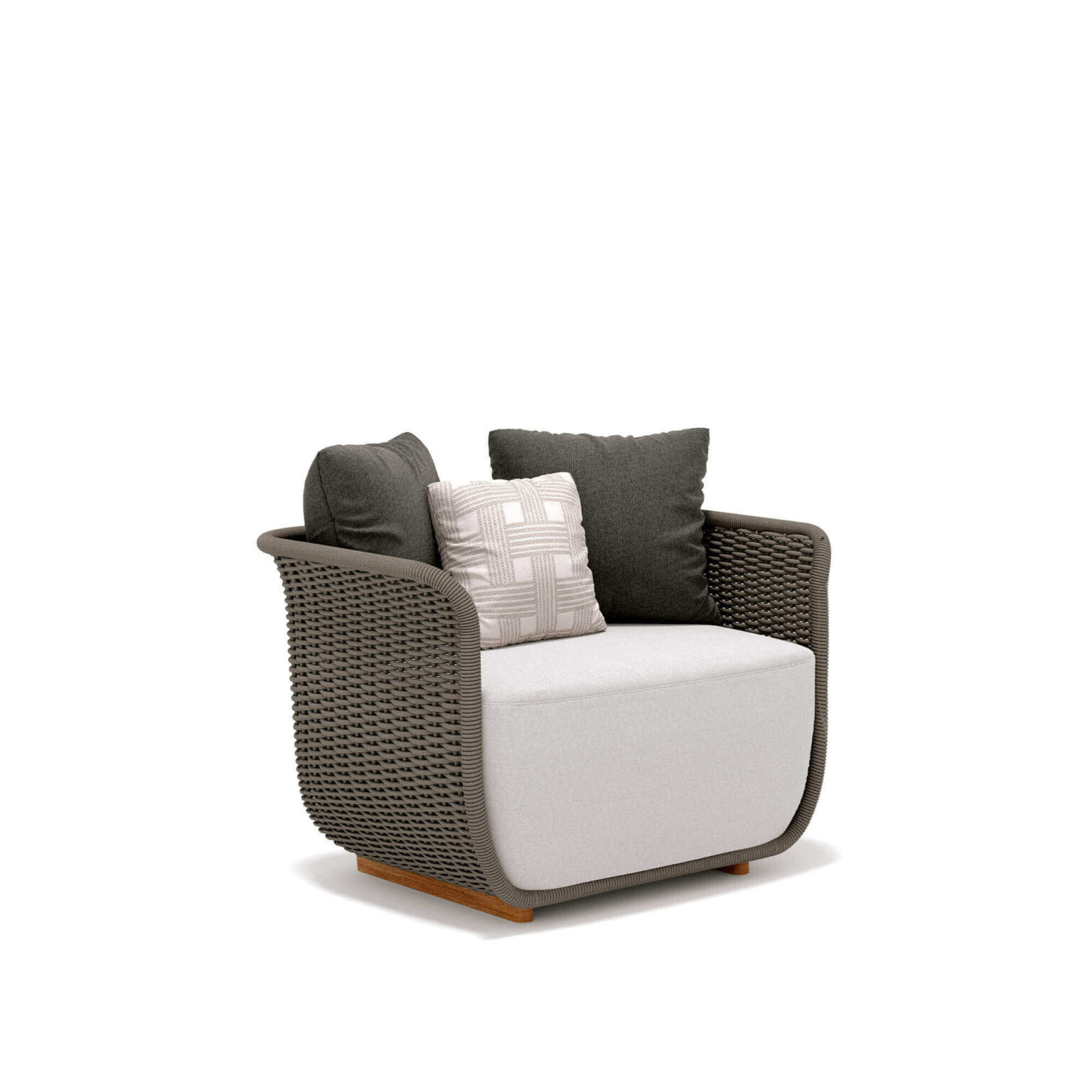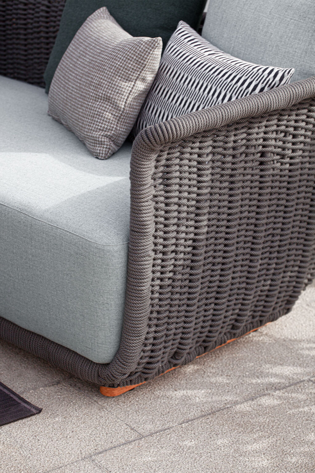 Subtle chromatic assonances drawn by the hand-woven rope, the unifying element of the entire Bellagio collection.