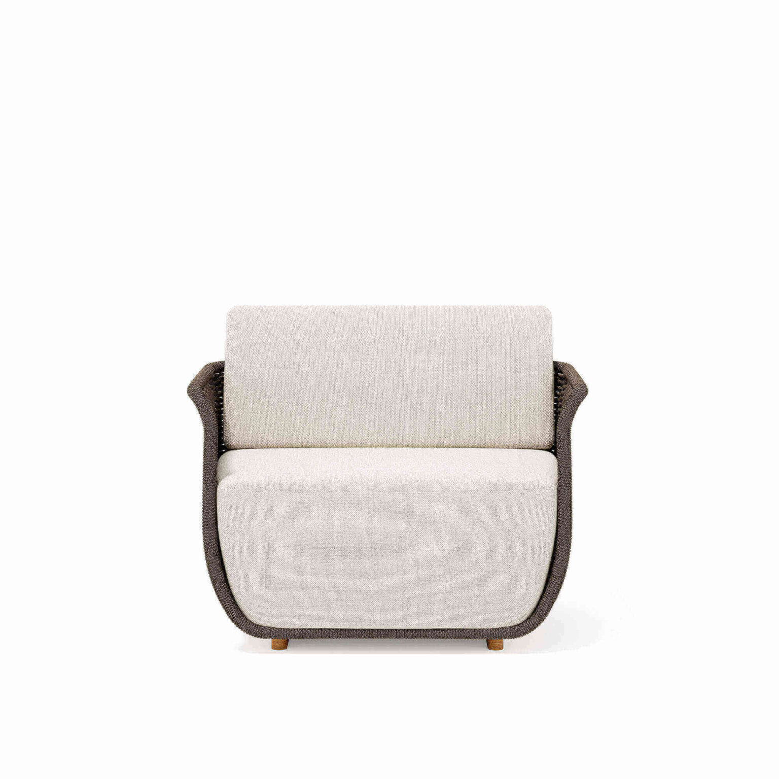 The series includes the armchair and sofa, characterised by light braiding made of melange-coloured acrylic yarn, which allows light to shine through.