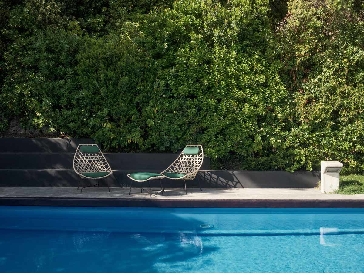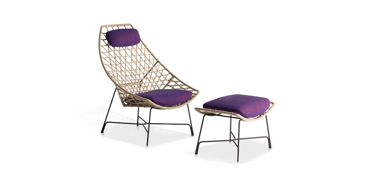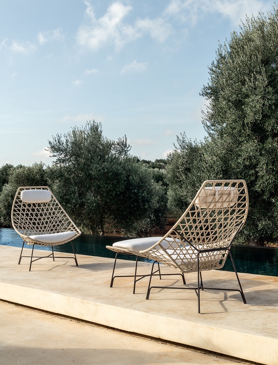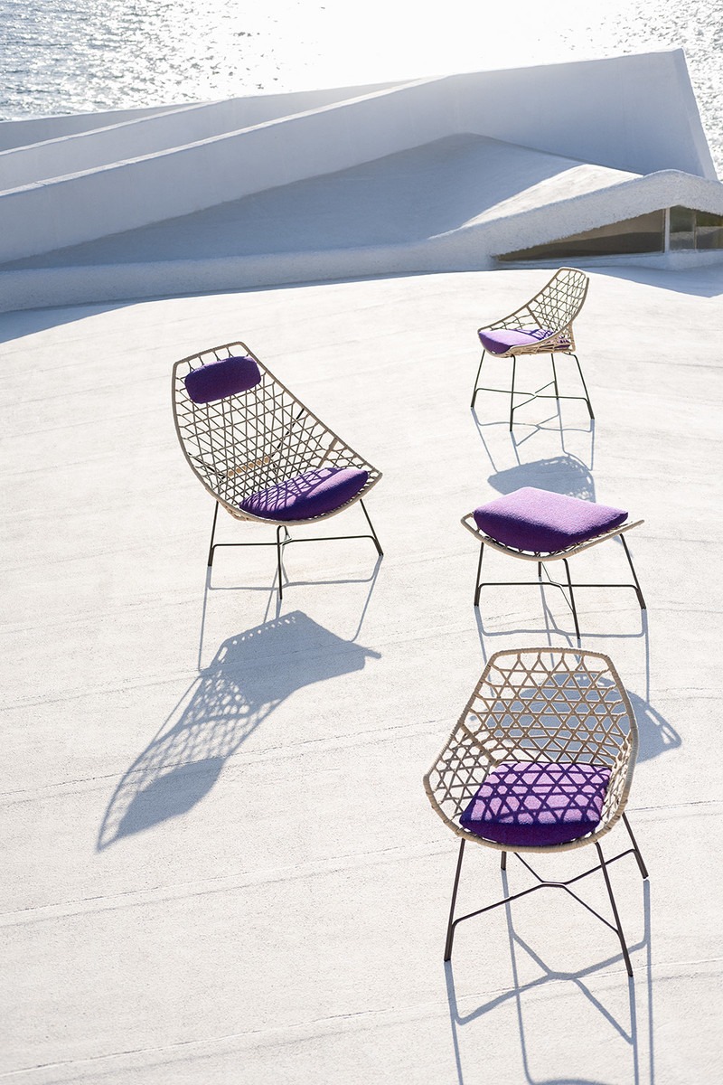 Cut is an embracing bergère with a light and comfortable look, with an epoxy powder coated steel rod frame and hand-woven seat and footrest / pouf in beige gassa rope.Seat cushion and headrest upholstered in fire-retardant polyurethane foam with cover in the outdoor coverings as per collection.