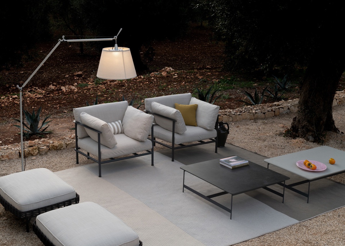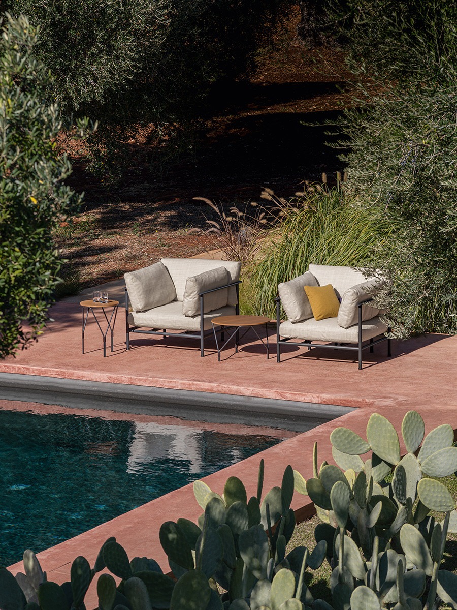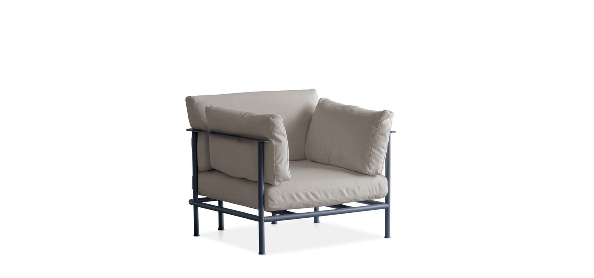 The Elodie lounge chair retrieves the essential visible structure of the homonymous two-seater sofa. Large cushions, made with materials suitable for both indoor and outdoor use, rest on a flat metal blade that runs all around the cushions supporting it.The peculiarity of this model lies in the seat’s upholstery, which thanks to particular supports, detaches itself from the structure appearing suspended.Elodie has a structure in anthracite or Aval embossed painted metal tube. The padding is in fire-retardant polyurethane foam.