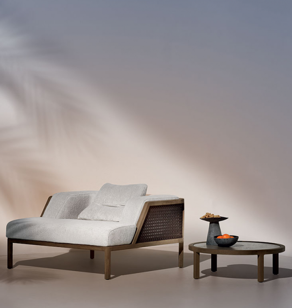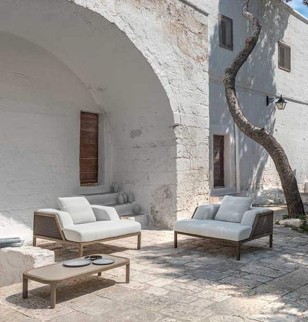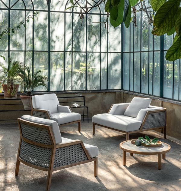 Lounge armchair with structure in natural or pickled teak and weaved ropeA new collection of lounge chairs destined for large and prestigious outdoor spaces. The pickled or natural teak structure with metal core is covered with large cushions that welcome the body with a feeling of deep and enveloping comfort.The weaving, inspired by the classic Vienna straw, is made of synthetic material, resistant to UV rays and abrasion. The large proportions, the soft cushions made with soft-touch fabrics and specific for outdoor use, increase the sense of comfort and well-being.A collection for a 'Grand Life' en plein air capable of transmitting tactile sensations and visual characteristics of the most elegant indoor situations.