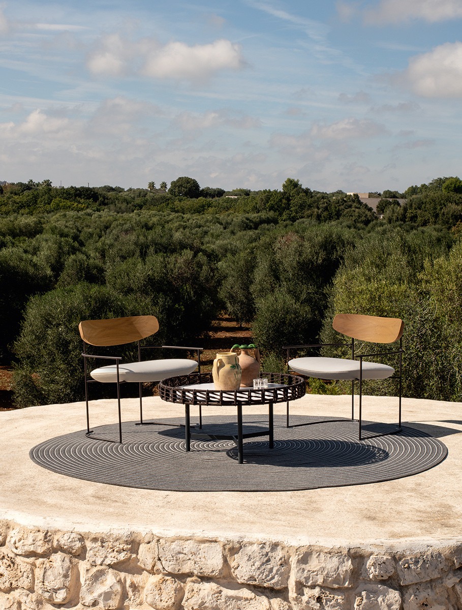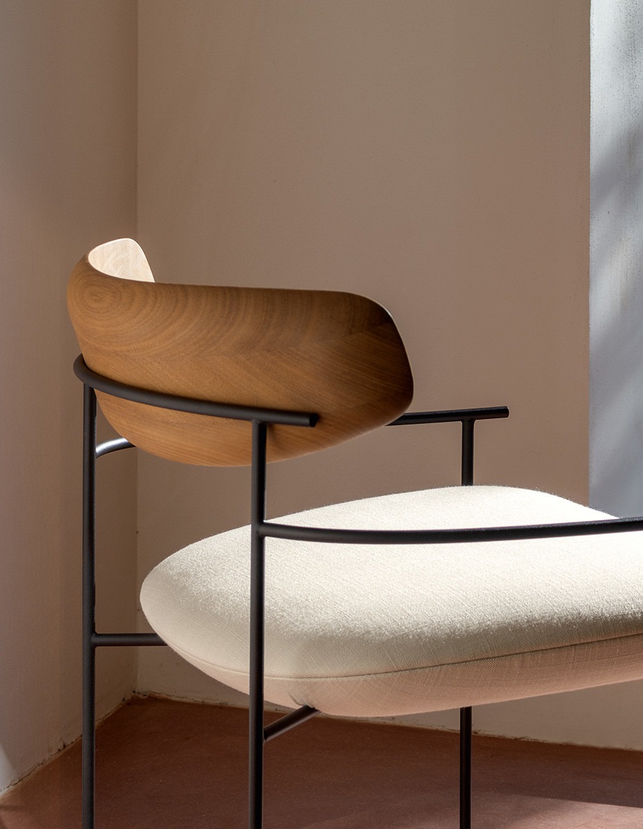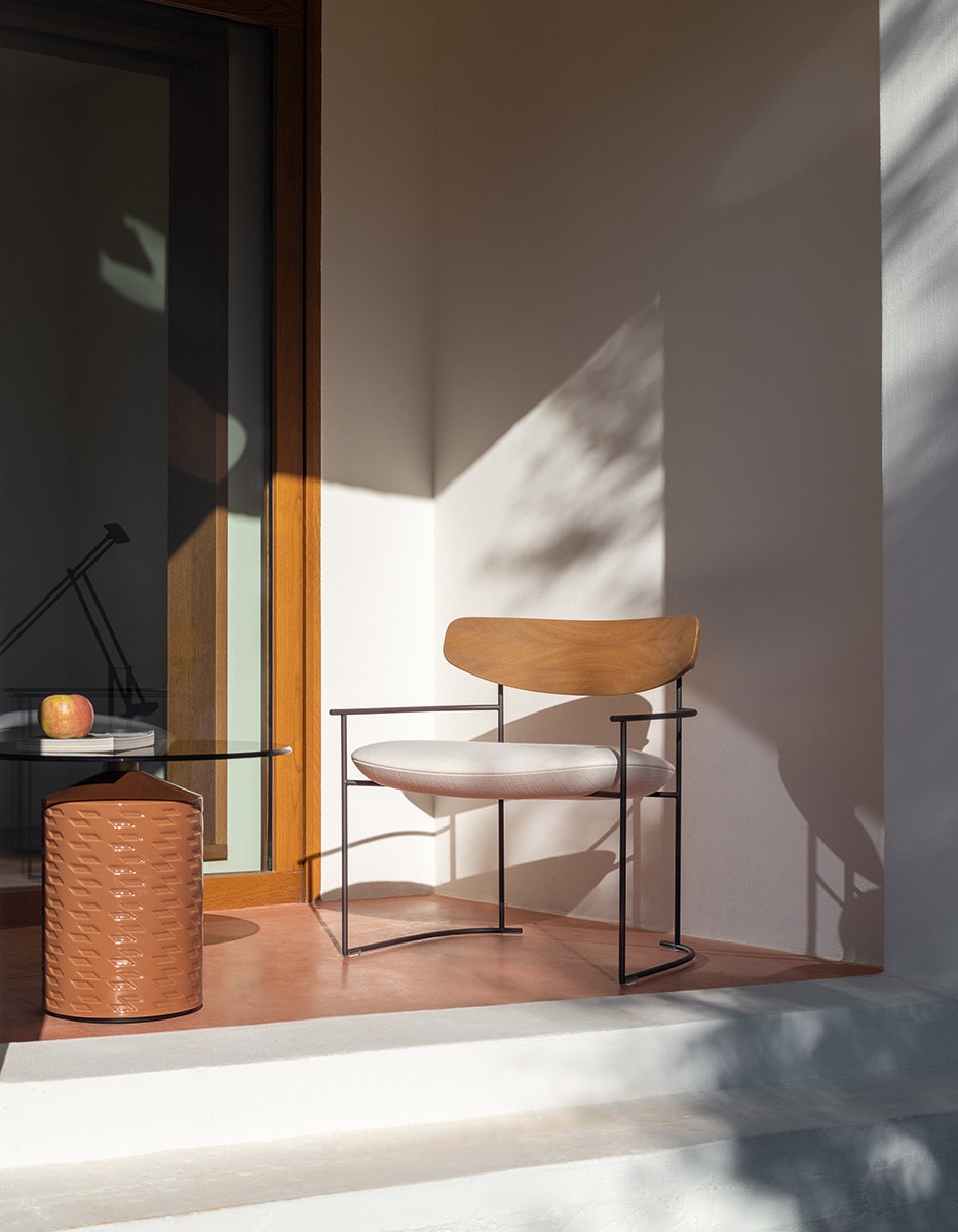 The Keel armchair, part of the homonymous collection consisting of a chair, small armchair and stools, is the result of the research into the relationship between geometric rigor and organic sinuosity. This armchair features a linear structure in metal rod and support elements in solid Iroko wood.The version with a structure in Pearl White embossed painted rod is available while supplies last. Please contact the sales office to check availability before placing an order.