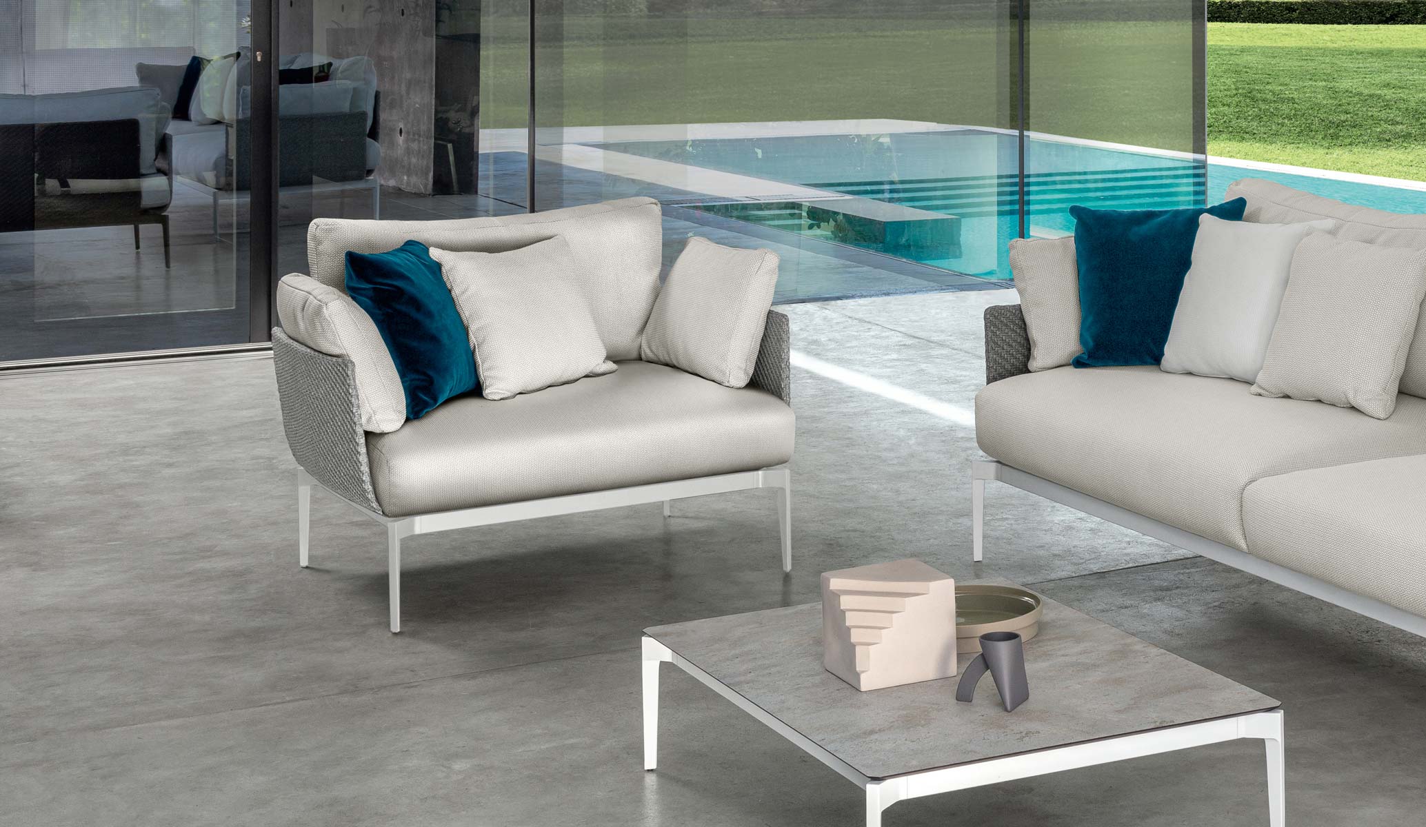 The Leaf living armchair is characterised by an elegant and light aluminium frame combined with very soft and sensual cushions. Its comfortable seat will be perfect to spend beautiful days or long summer evenings sitting comfortably under a starry sky.This living Armchair is the ideal product to bring out your outdoor space.