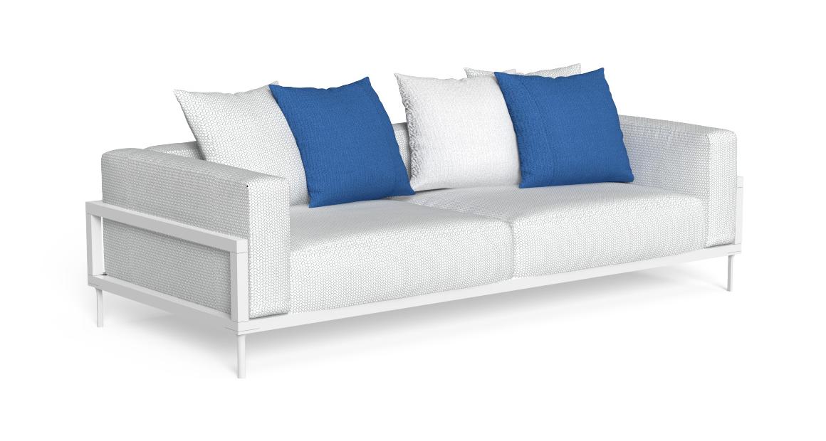 The CleoAlu 3-seater outdoor sofa summarizes the volume, shape and balance characteristics of the entire collection. The voluminous padding of the seat and backrest, made of removable fabric, easy to wash and weather resistant, is placed on a powder-coated aluminium structure. The padding is in quick dry foam.