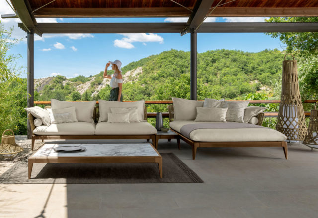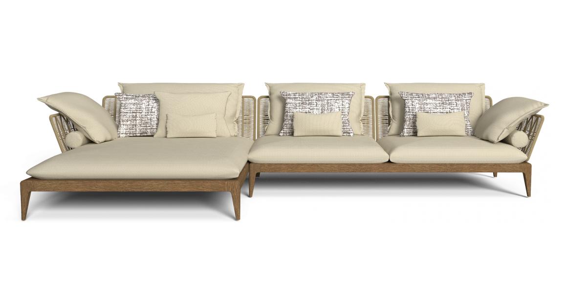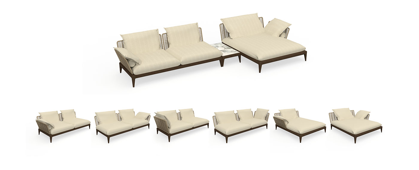 Extremely versatile, the Modular Sofa of the Cruise Teak Collection is perfect to design your outside living area. Entirely modular, the product maintains the quality and the style of the collection. The structure of its modules is made of wood indeed. The synthetic rope is used for the cover of armrests and backrest. The cushions’ fabric, carefully selected, makes the sofa weatherproof. The natural and light colours proposed by this collection, together with the various combinations supplied by the product’s modules, make the Modular Sofa ideal for each outside environment.