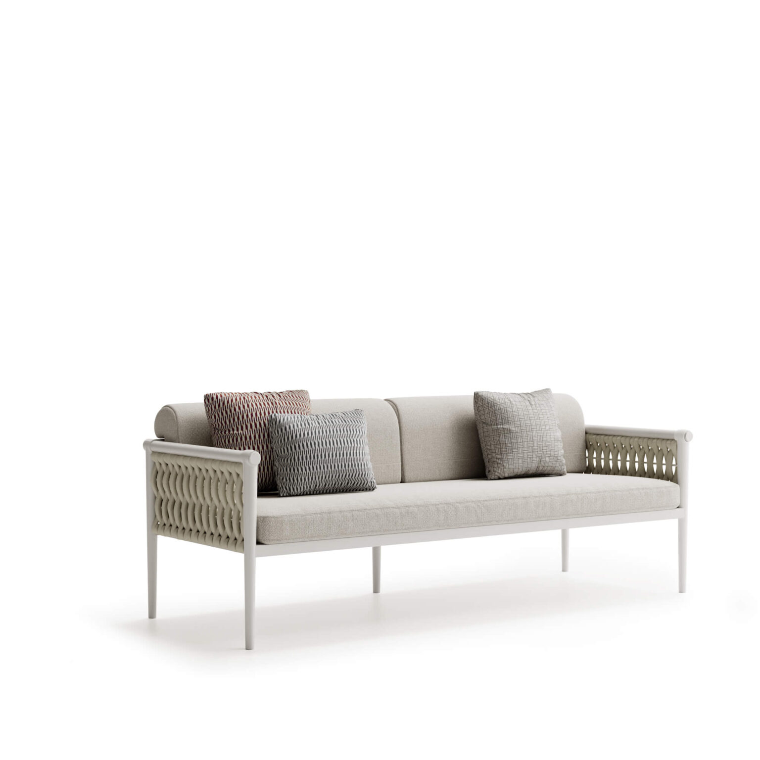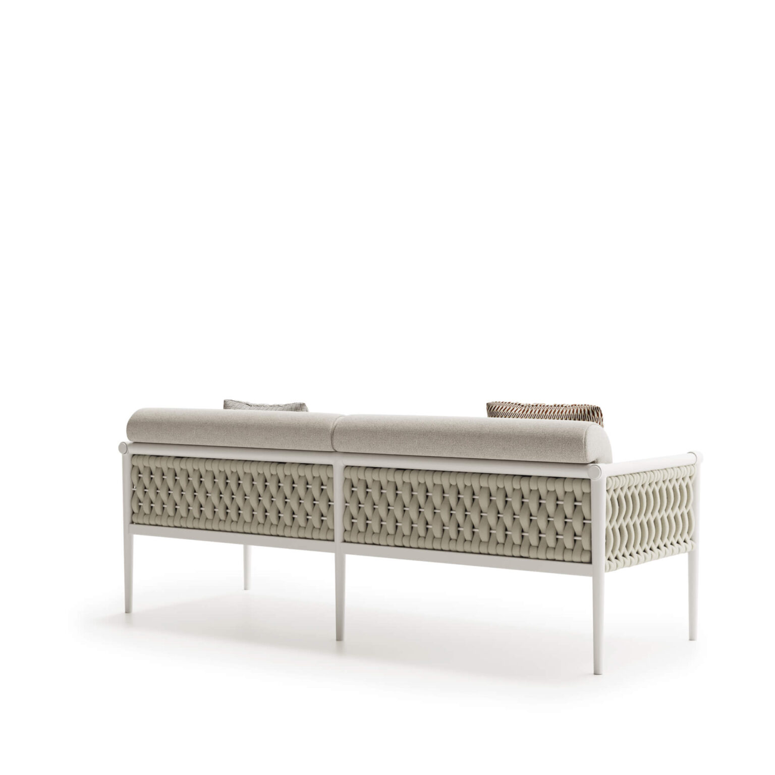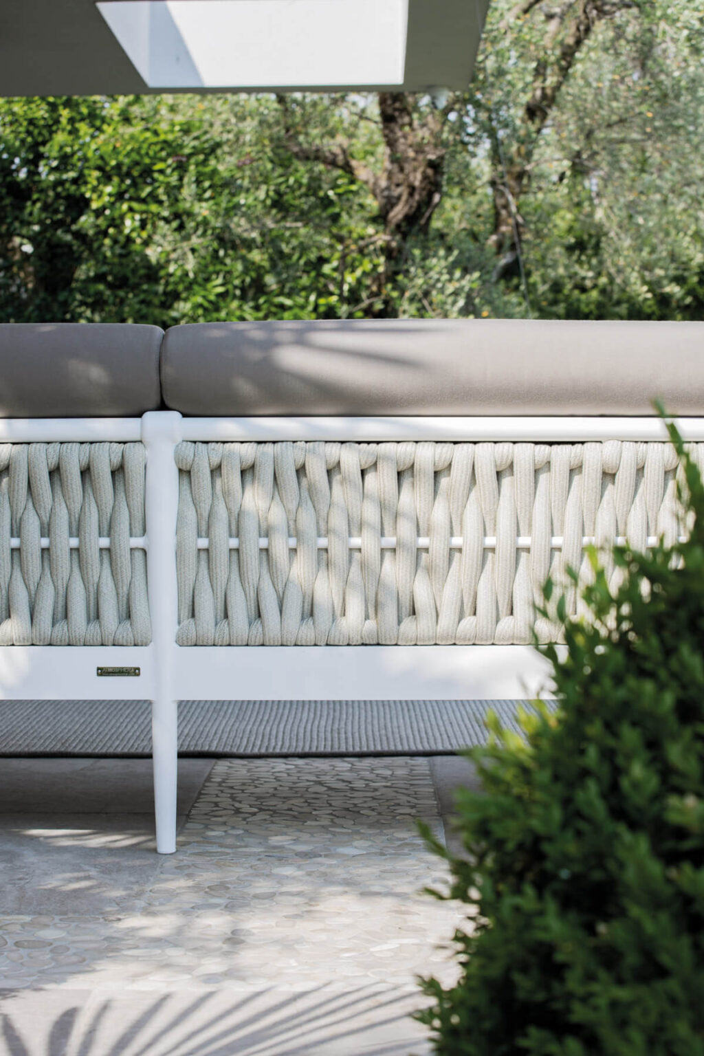 As in the tie the knot becomes a detail of elegance and element of distinction, the sofa Dandy interprets the concept through an aluminum structure woven with soft ropes thickened as textile fibers.